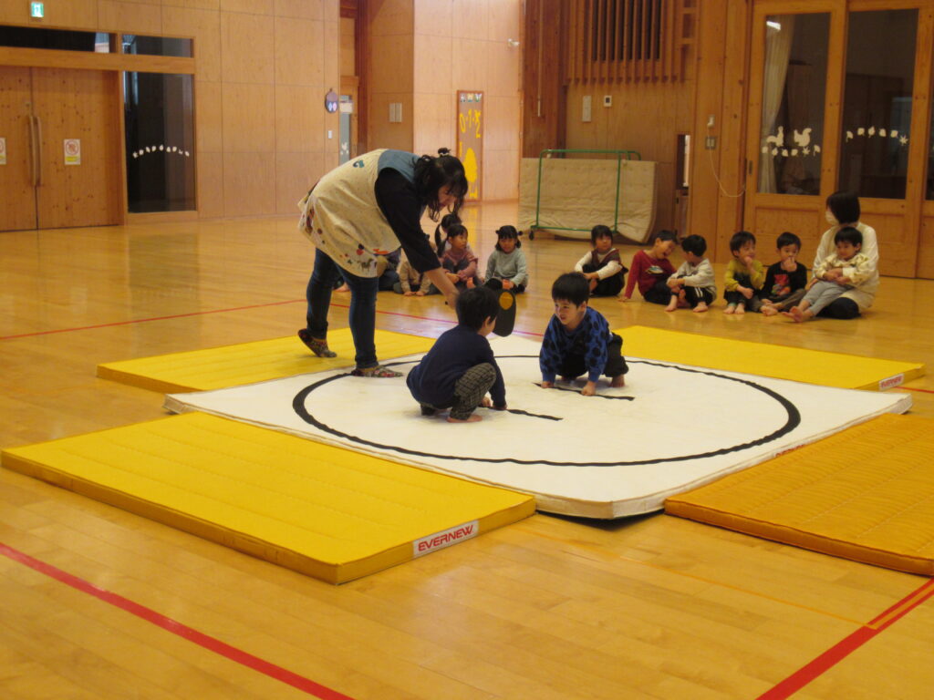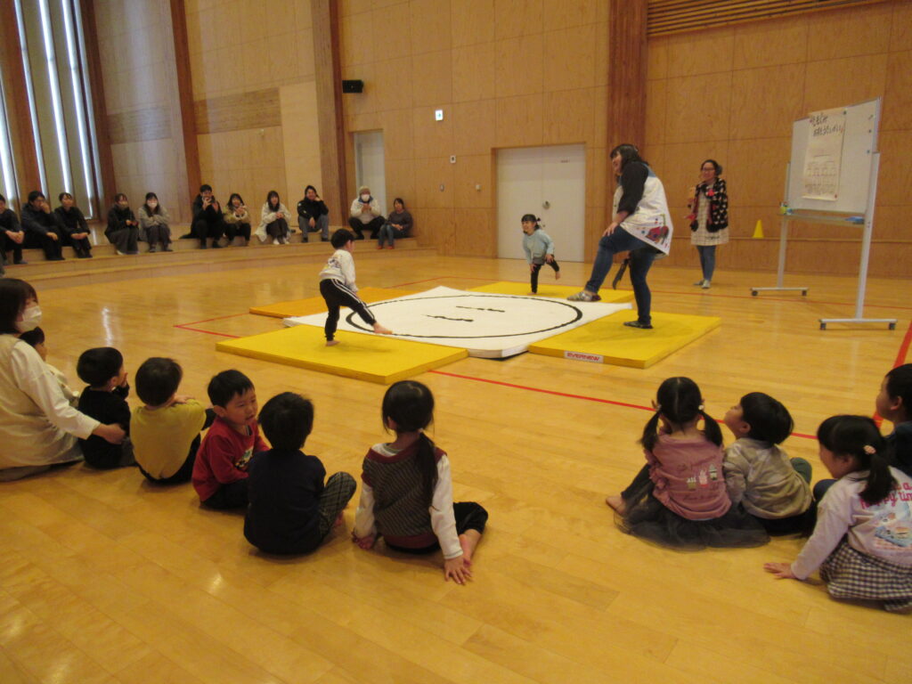 2月5日(木)もも組の保育参観日にクラスのおすもう大会が行われ、保護者が見守る中、力いっぱい対戦しました。勝ったり負けたりしながら皆で楽しく活動に取り組み、最後にはご褒美のメダルをもらいました。参観が終了して保護者が帰る時にほとんど泣く子がいなかった様子に、春からの成長を感じます。その後は希望者に給食の試食をしていただきました。お忙しいところありがとうございました。