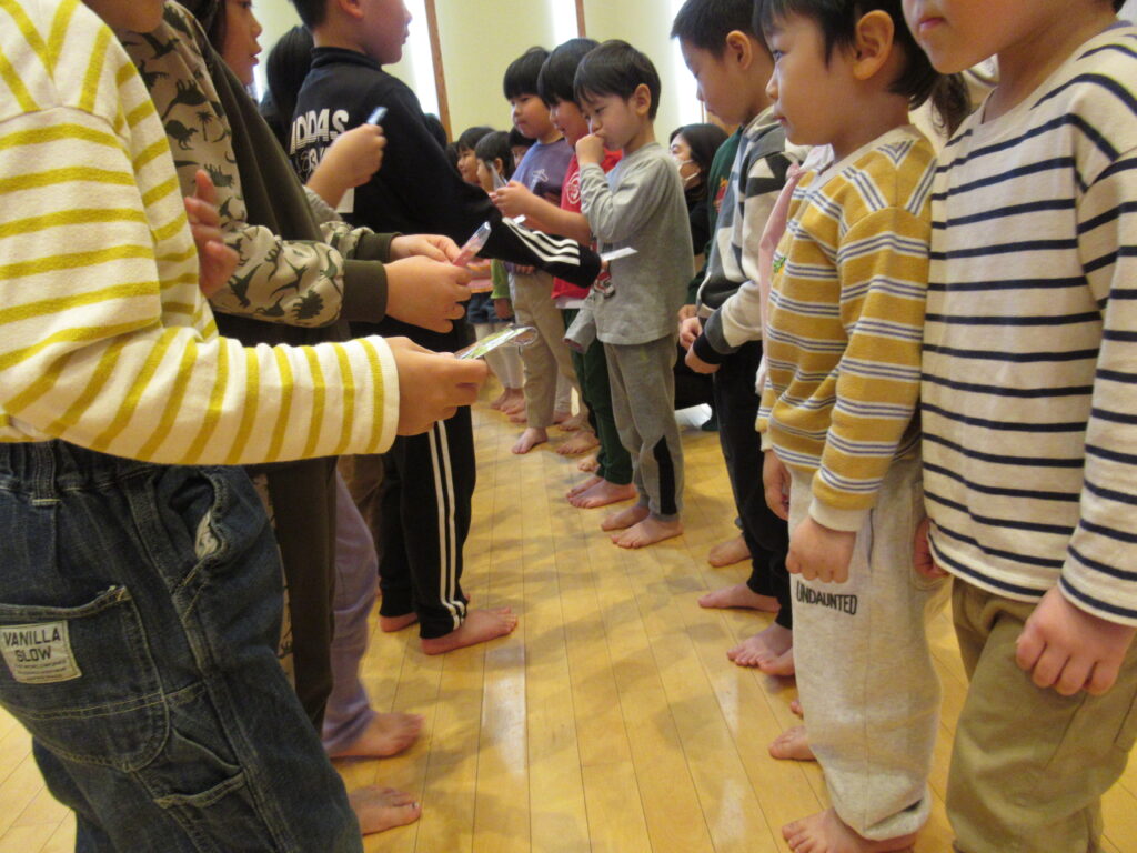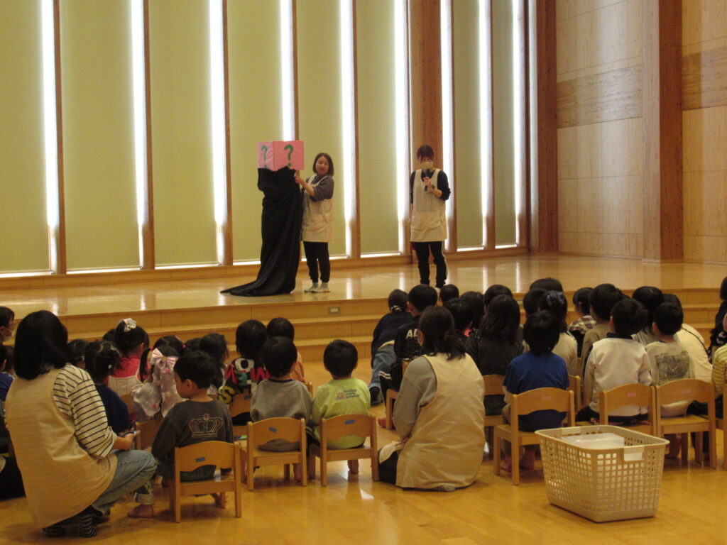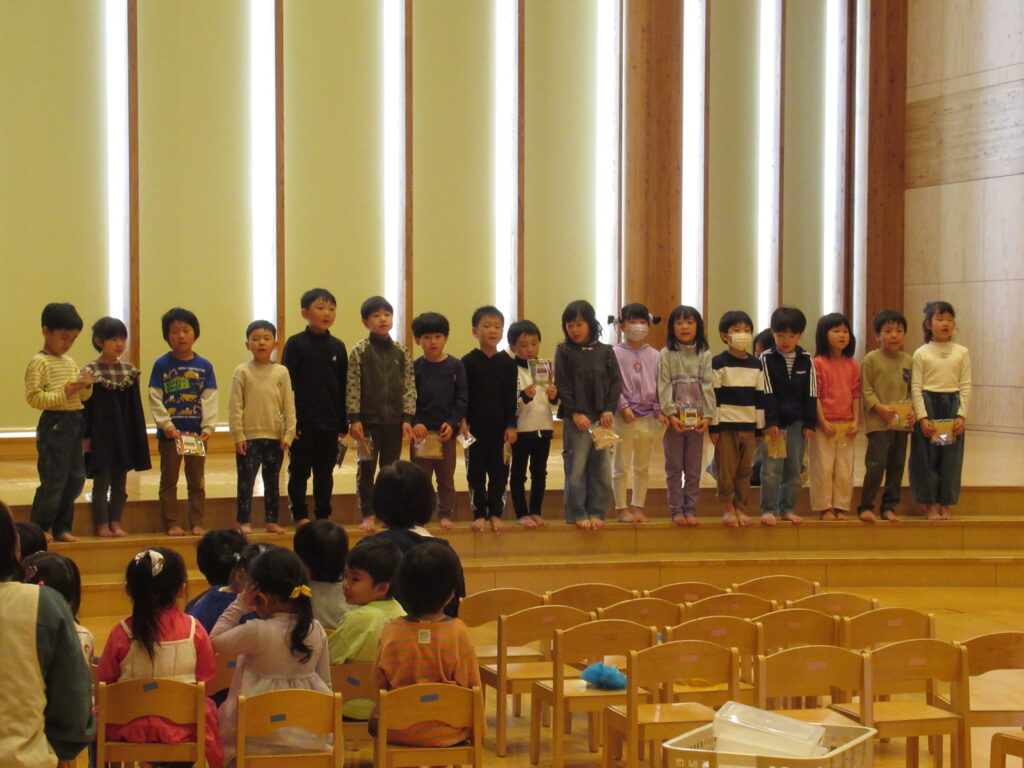 今日は、卒園や進級を全園児でお祝いするお楽しみ会を行いました。先生達からの出し物は、全身を隠した人は誰なのかを当てるクイズでした。各先生たちが声を変えたり、大きく見せたり、小さく見せたりしながら子ども達の質問に答え、名前を当ててもらいます。「○○せんせ~」と正解と思った名前を口々に呼びながら、みんなで盛り上がっていました。その後、プレゼント交換をしたりさくら組の思い出のスライドショーをみたりと楽しいひと時を過ごしました。