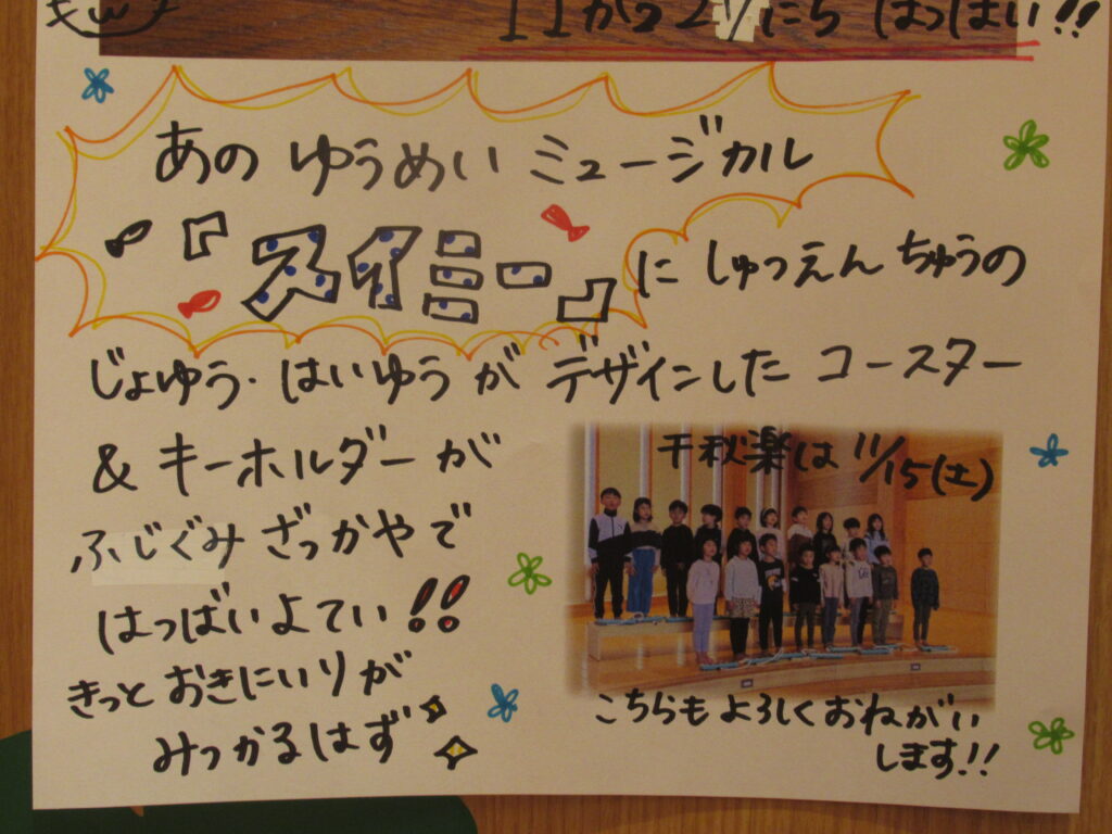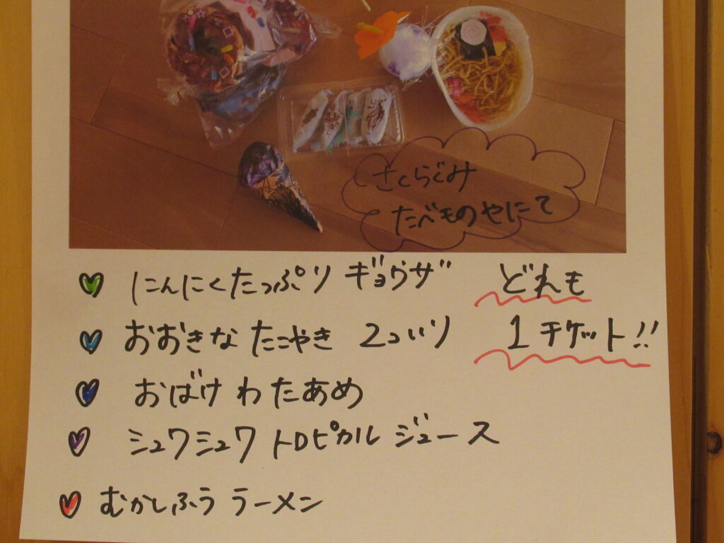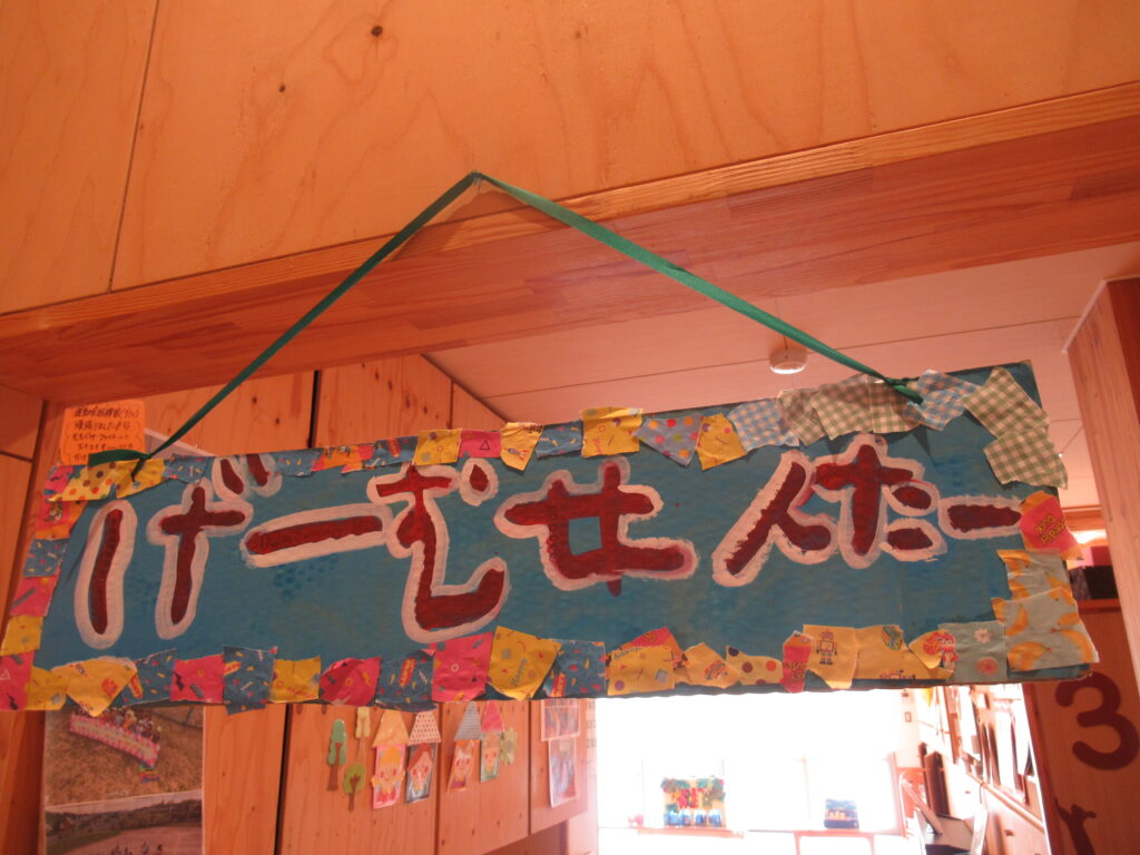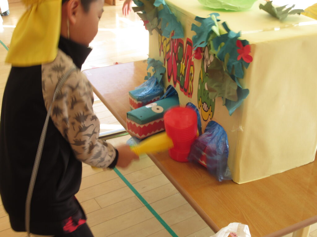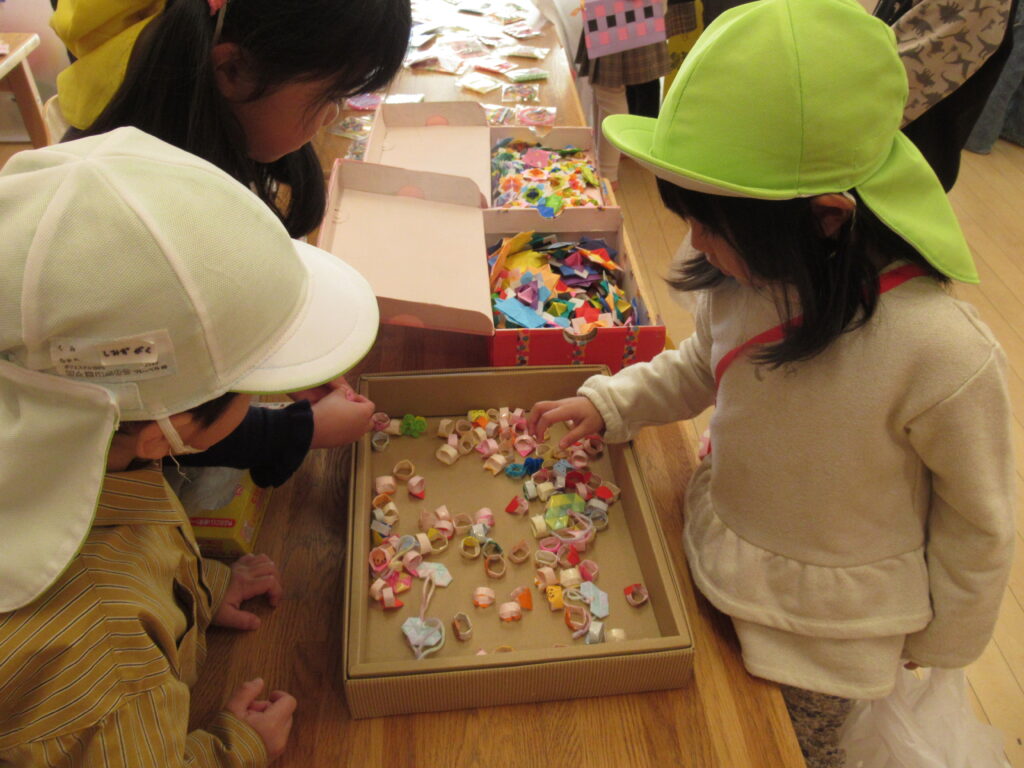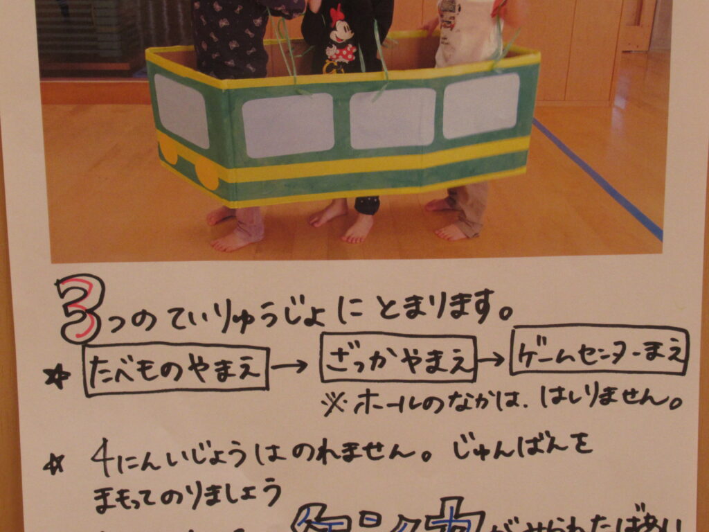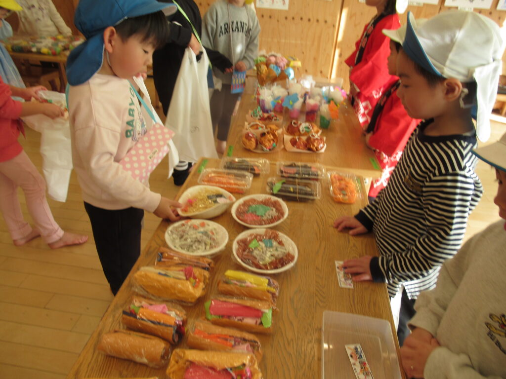 11月27日(木)は11月生まれのお友達のお誕生会でした。今日はお誕生児をお祝いした後、おたのしみの遊びの広場でお店屋さんごっこを行いました。もも組はゲームセンター・ふじ組は雑貨屋さん・さくら組は食べ物屋さん、三つのお店を回るバスも運行されていて、子ども達が少しづつ作ってきたものをお店屋さんとお客さんに分かれて交代しながら楽しみました。後半は乳児のお友達も先生と手をつなぎお買い物にやってきて一緒に遊びました。先に買い物を終えた子は、遊戯室のコーナーで買ってきたものを広げお弁当やお菓子を食べたり、買い物したものを見せ合ったりしていました。