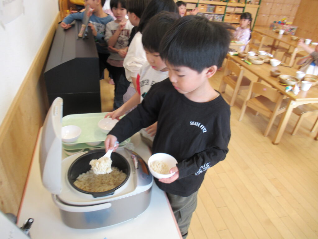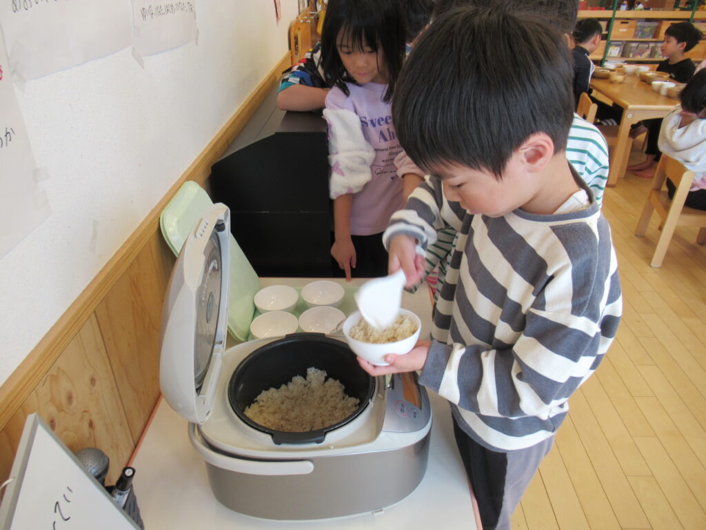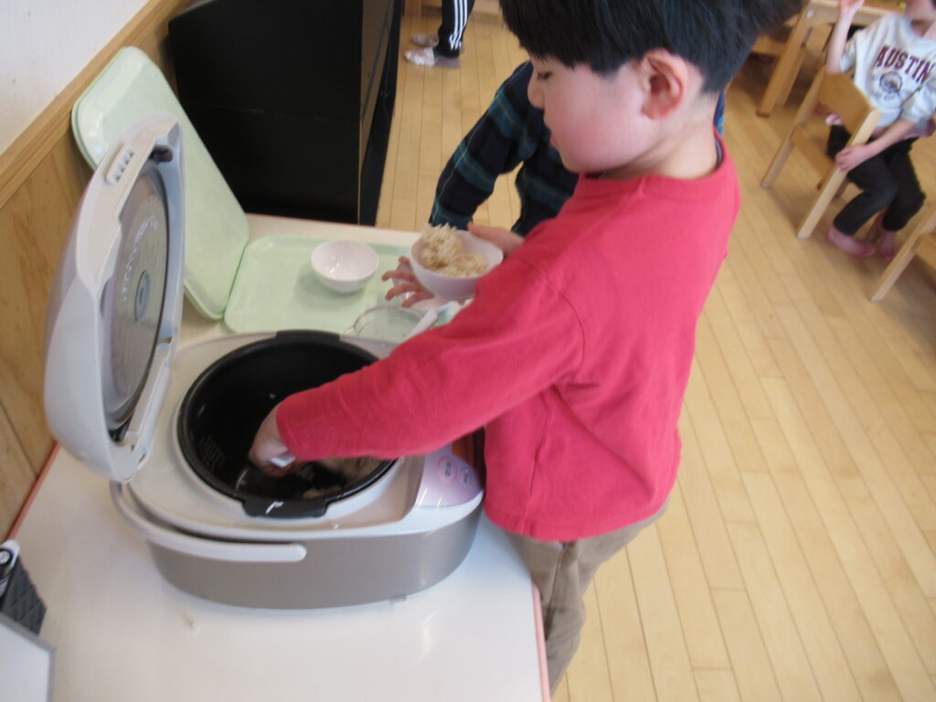 こども園では初めてのしゃもじでしたが、上手に盛っていました。