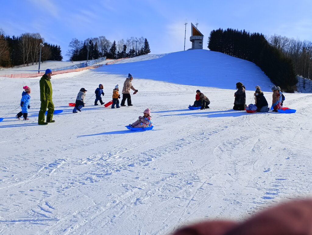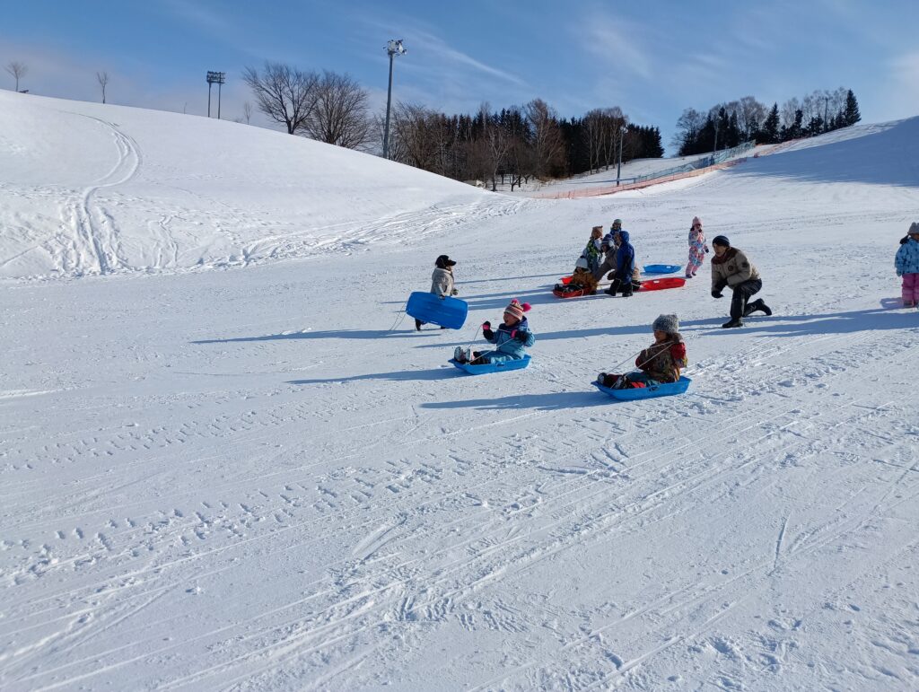 津別町、今日の最低気温は-20℃。かなり寒かったのですがもも組のみんながバスに乗ってスキー場まで行き、そりあそびを楽しんできました。しっかり踏み固められた雪面はとってもよく滑ります。一人で滑ったりお友達と一緒にそりに乗ったりと何度も繰り返し大満足の一日でした。