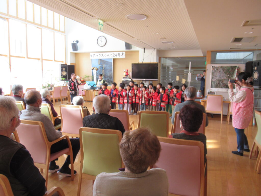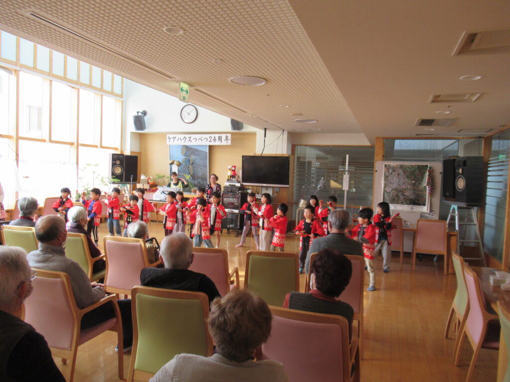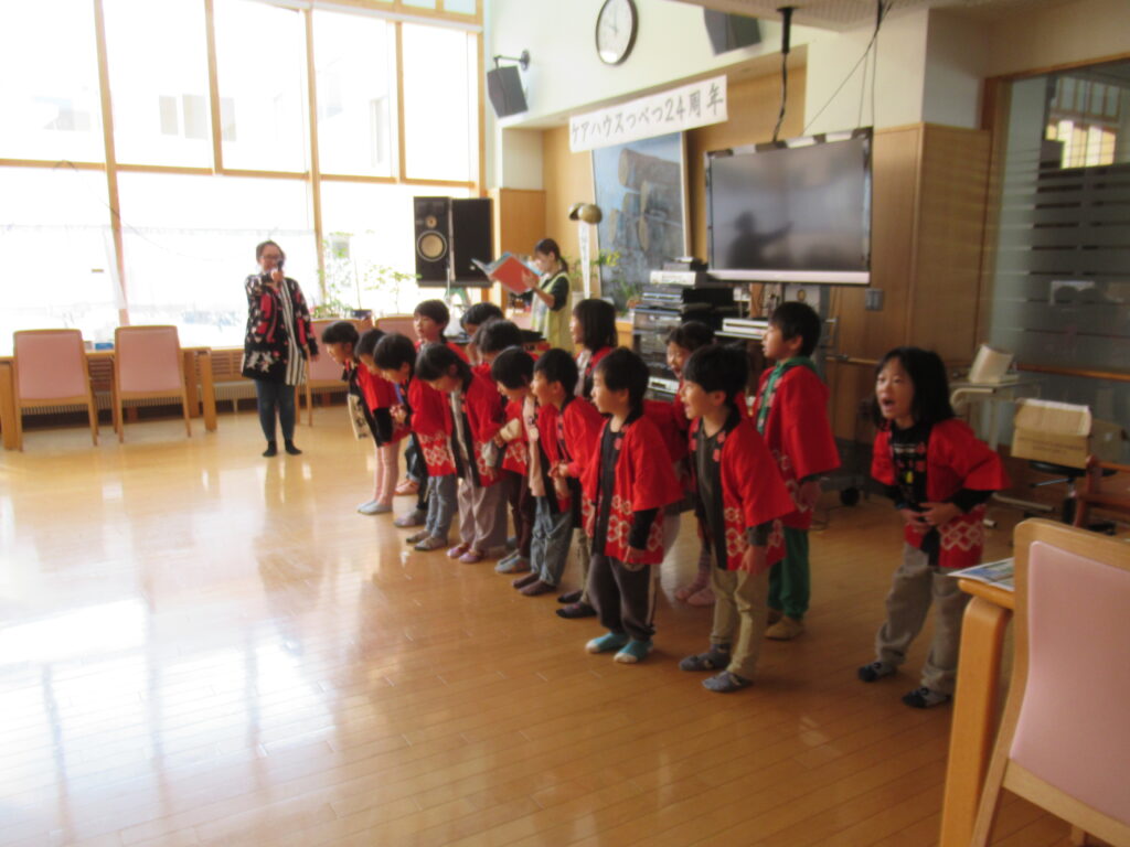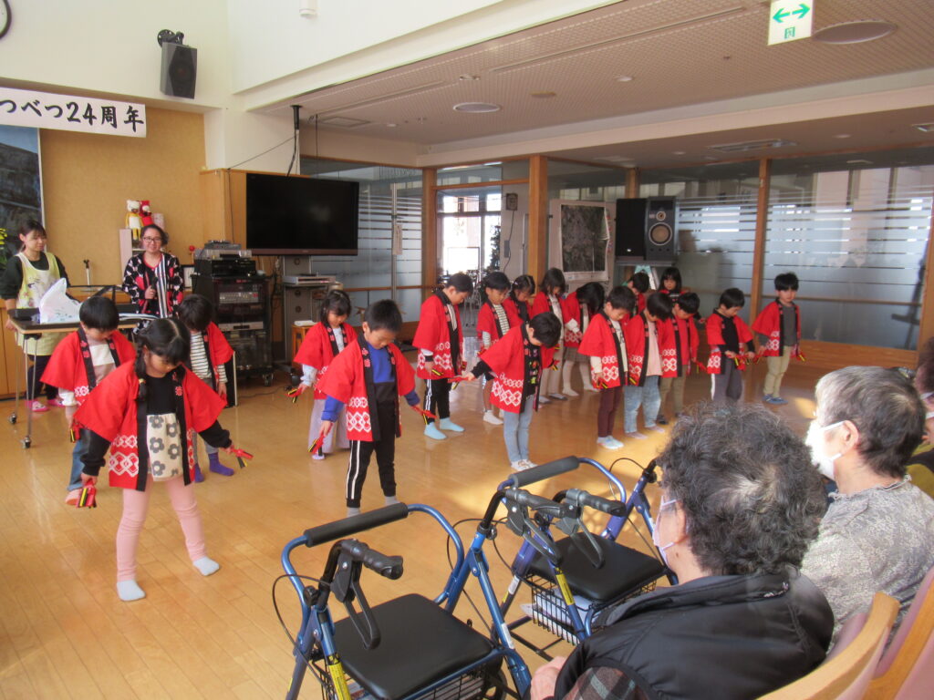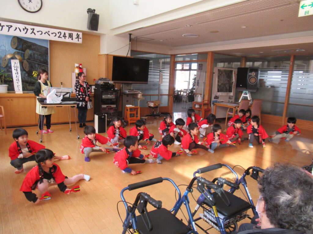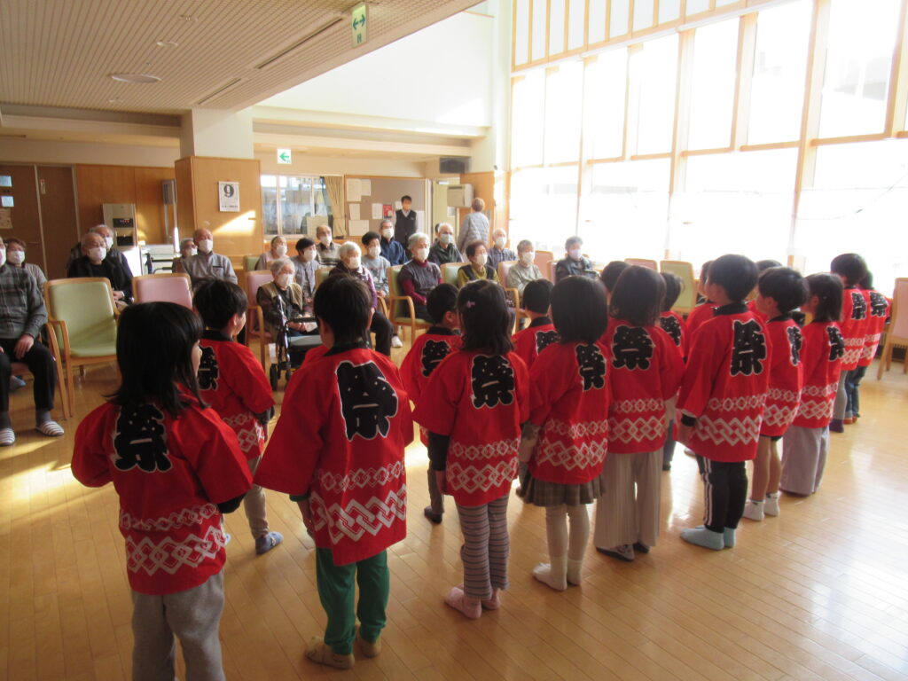 12月9日(火)さくら組の子ども達が近くにある高齢者施設ケアハウスに慰問に行きました。先月行われた発表会の演目の中から鳴子を持って踊る遊戯「南中ソーラン」と、いつも歌っている歌「おもちゃのチャチャチャ」「ゆき」「あわてんぼうのサンタクロース」「あおいそらにえをかこう」の4曲を披露しました。「かわいいね~」と皆さんにとっても喜んでいただきました。