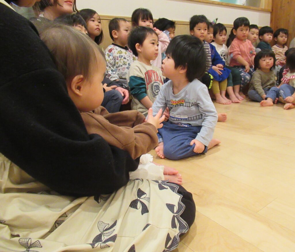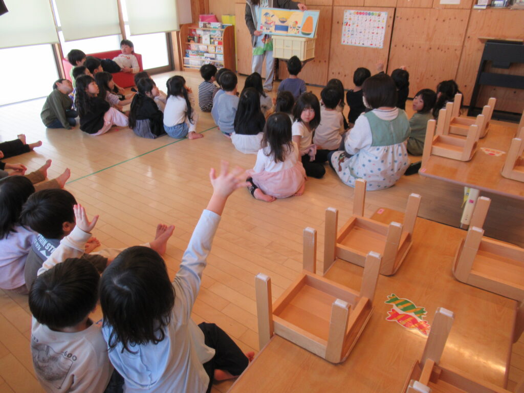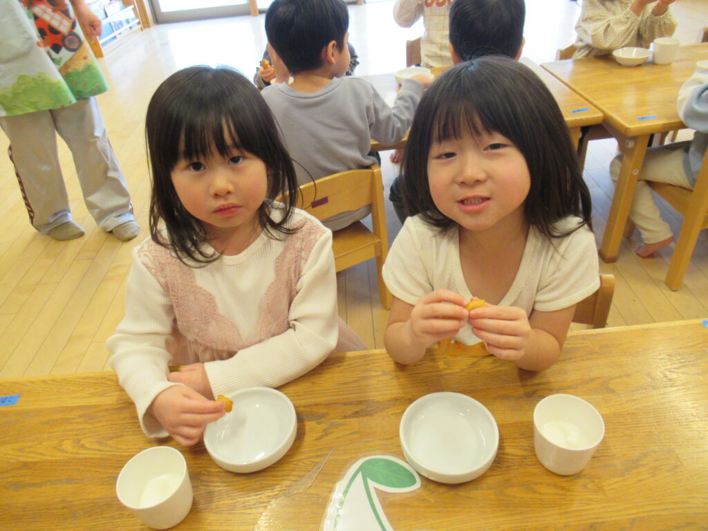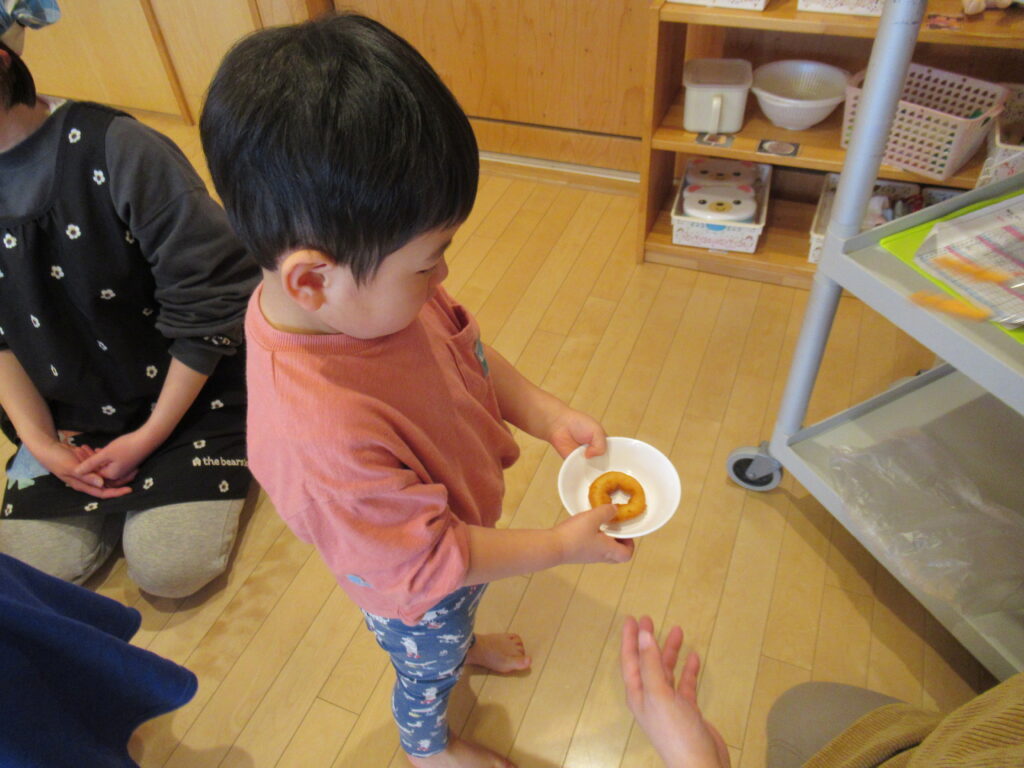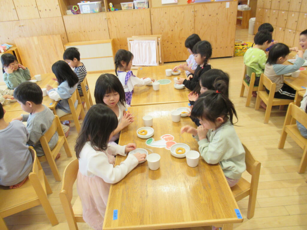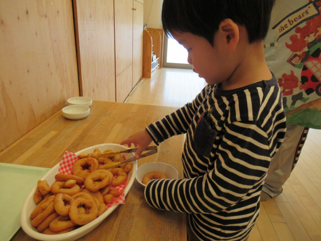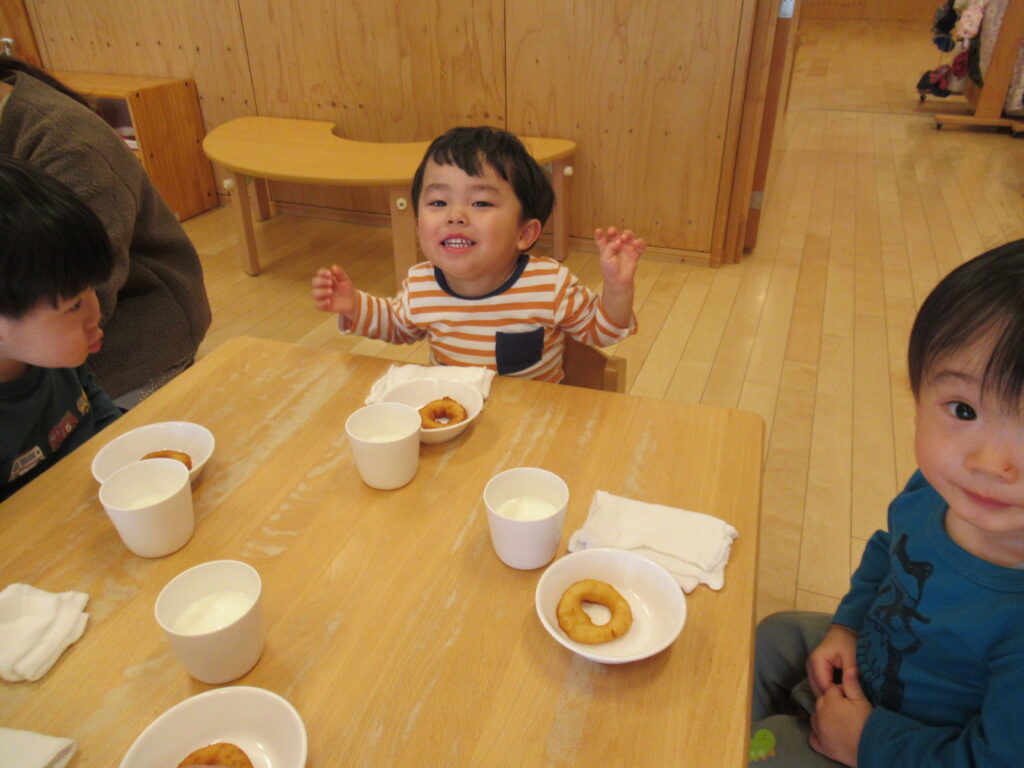 バムとケロの山盛りドーナツ🍩 2026-01-21 食育だより 今日のおやつは、「バムとケロのにちようび」の「山盛りドーナツ」でした。みんな、山盛りドーナツを目の前にし、大喜びです。じゃがいもを使用して作った、もちもちのドーナツをおかわりして食べていました。