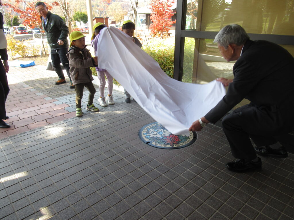 10月31日(金)、さくら組のみんなが10月31日(金)、さくら組のみんなが「つべつ木材工芸館キノス」の前でポケふたのお披露目にお手伝いをしました。北海道を盛り上げているロコンとアローラロコンと一緒にメブキジカがデザインされた世界に一つしかないマンホールです。