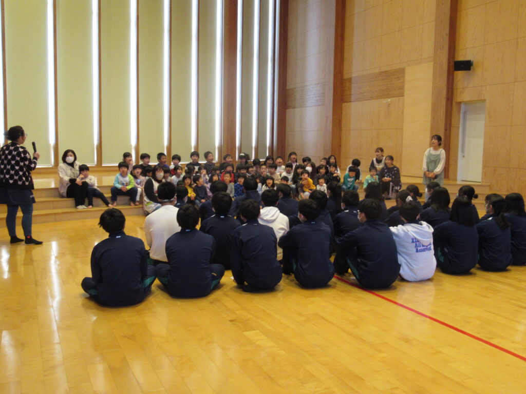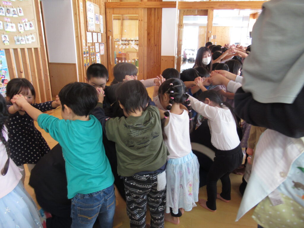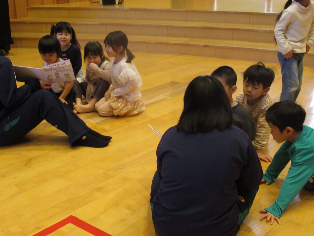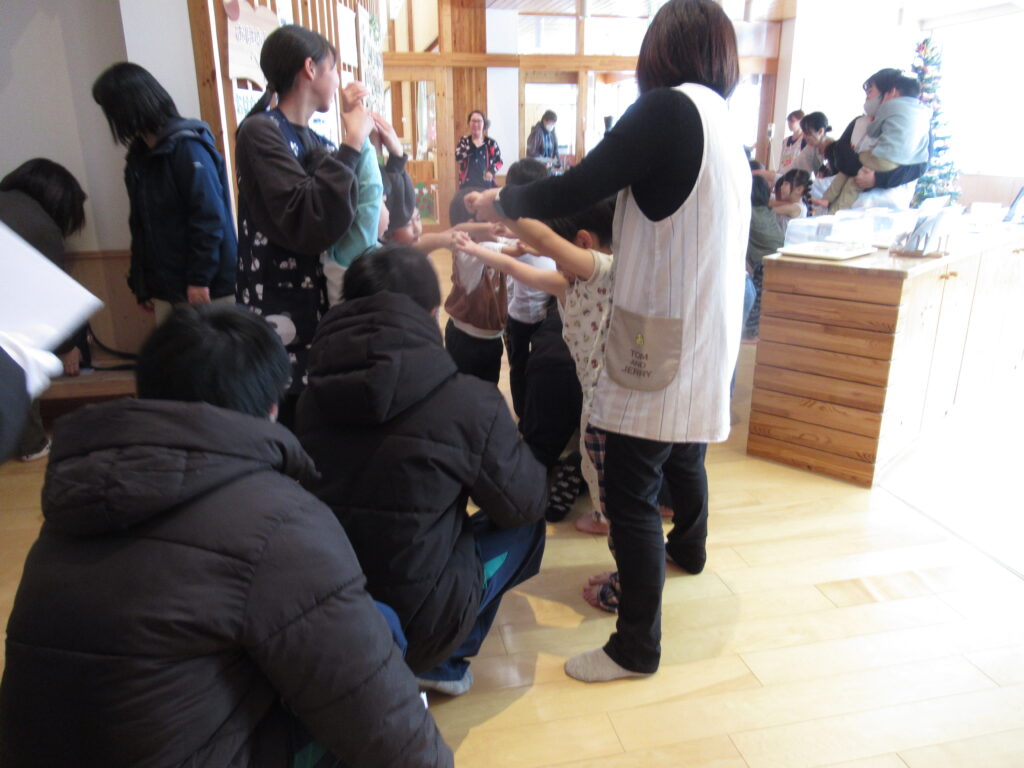 12月22日(月)、中学3年生が家庭科の時間に一人1冊ずつ手作りした絵本を持って、こども園に遊びに来てくれました。子ども達に分かりやすいような動物や果物等、1ページ1ページ丁寧に作られていました。中学生が3つの場所に分かれ、園児たちがそれぞれの場所に移動して絵本を読んでもらいました。全部読んだ後は鬼ごっこで遊んでもらいました。園児はお礼にあわてんぼうのサンタクロースの歌をプレゼント、最後はみんなで作ったトンネルを通って玄関まで。とっても楽しい時間を過ごした子ども達中学生のみなさんありがとうございました。9年前に卒園したみんなの面影が残っていて懐かしく感じました。