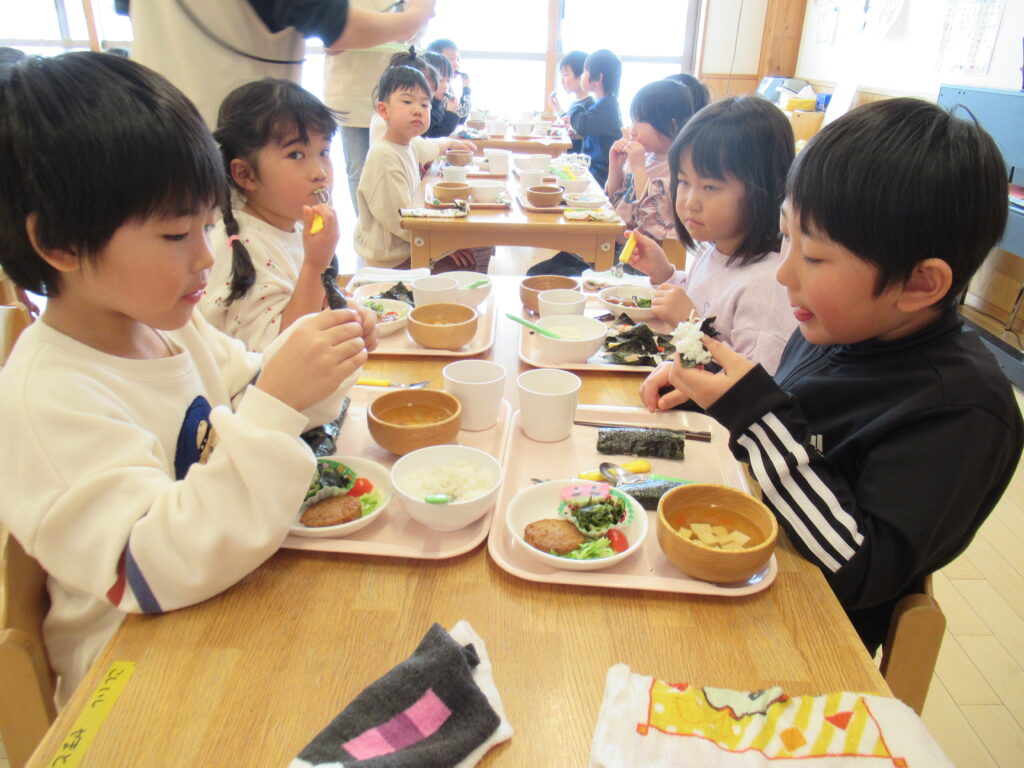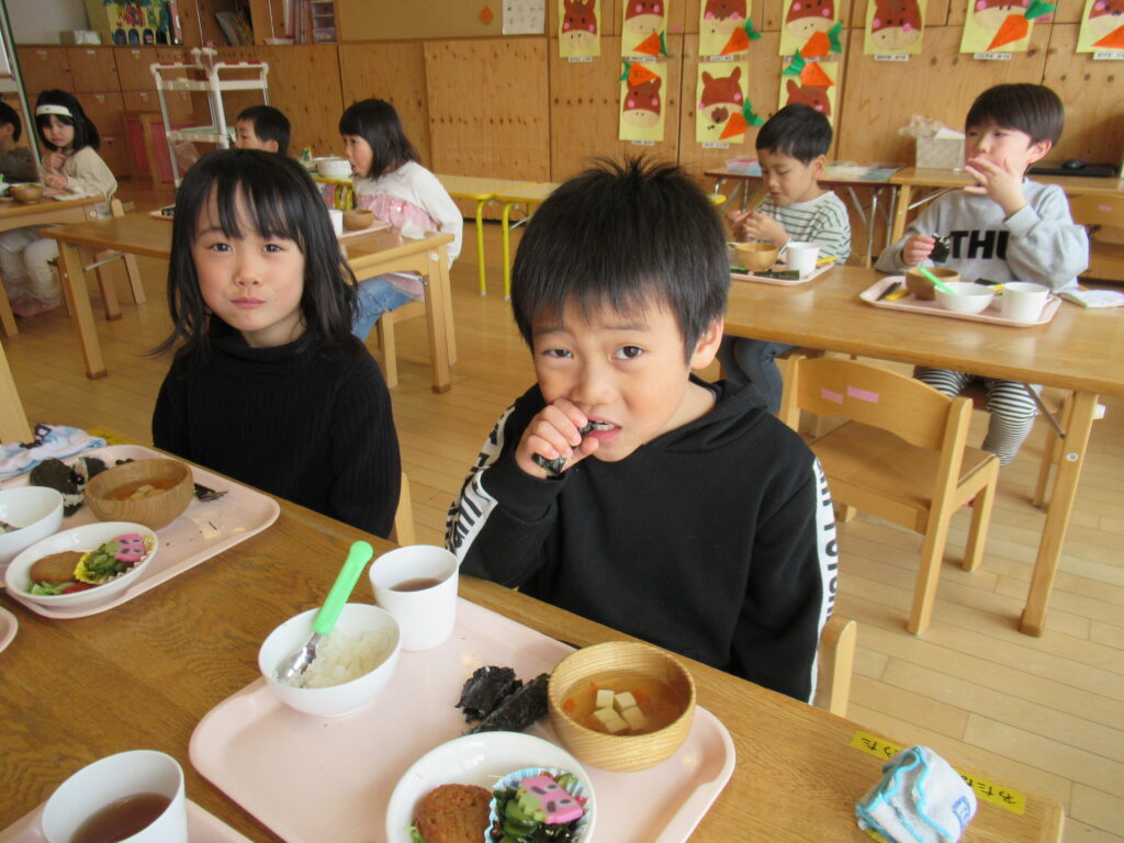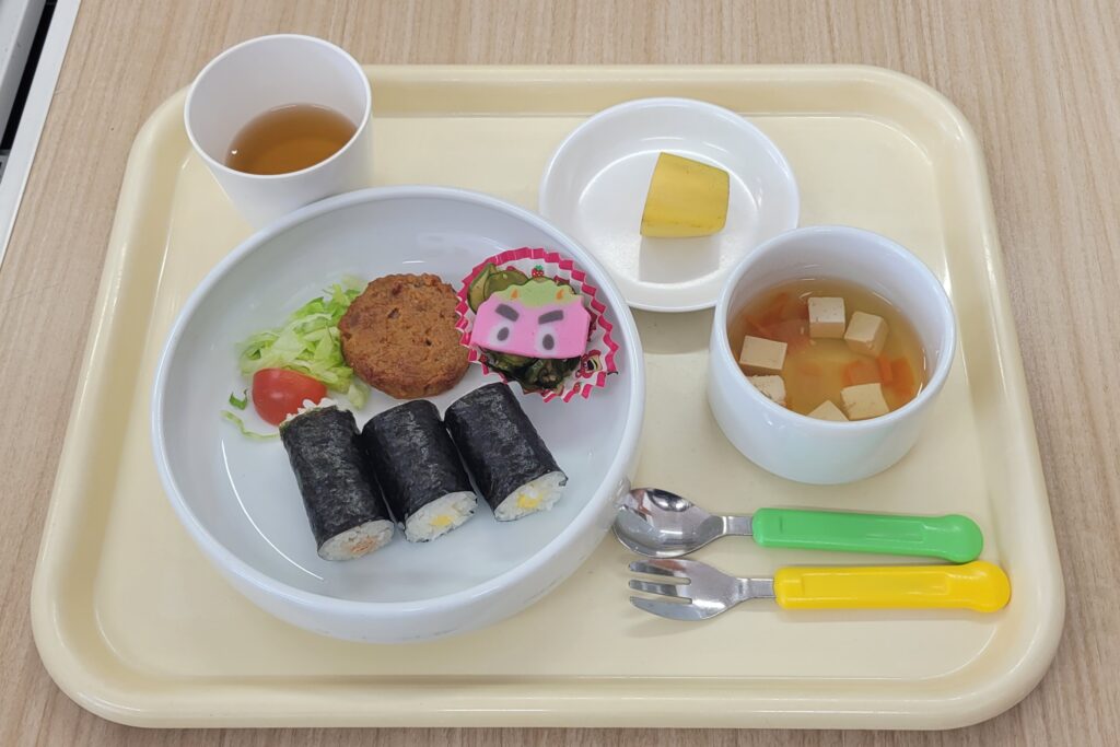 今日は節分です。恵方巻の代わりに、細巻きで提供しました。さくら組は自分で手巻き寿司を作りました。たまご・ツナ・かにかまの3種類の具を、ツナとかにかまにしたり好きな組み合わせで作っていました。自分で作った手巻きずしをおいしそうに食べていました。