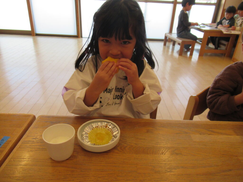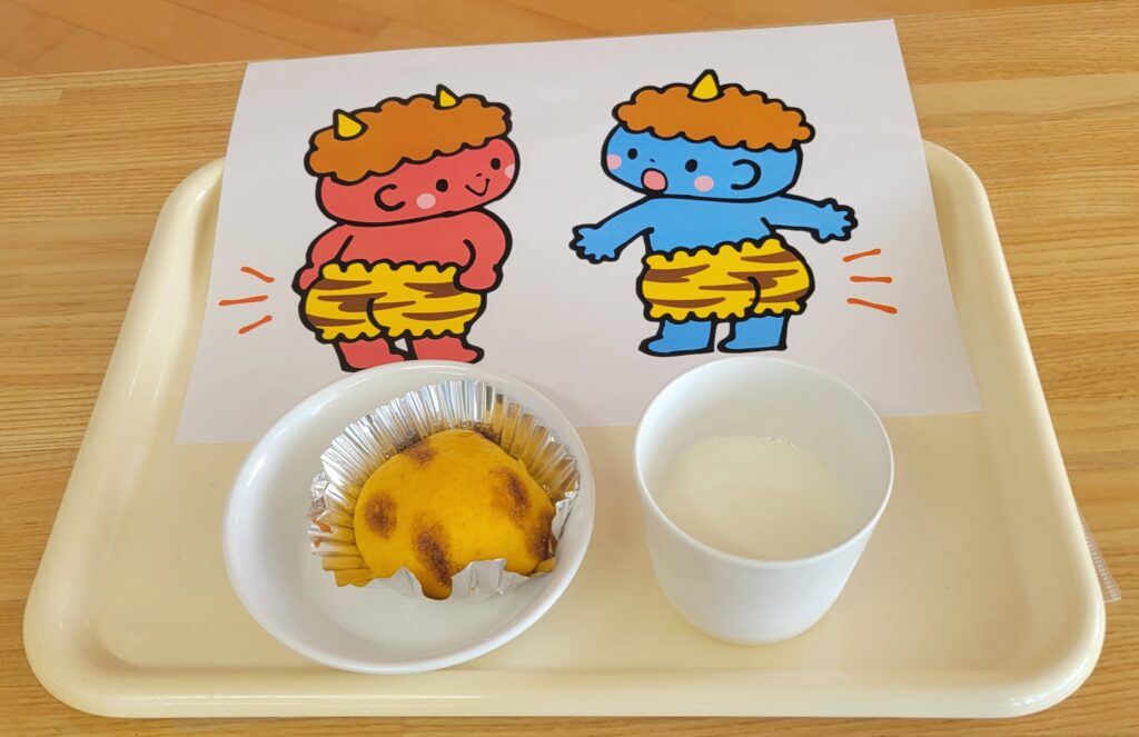 午後のおやつは鬼のパンツケーキでした。黄色はかぼちゃ、虎柄の茶色は黒糖を水で溶いて色を付けています。「甘い味!」「かぼちゃの味がする。」と言っていました。使用した食材を言う前に正解がわかる子もいました。よく味わっていてくれて嬉しいです。