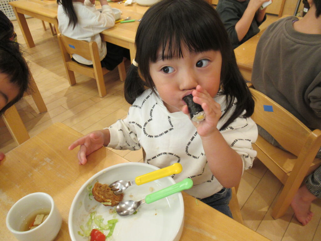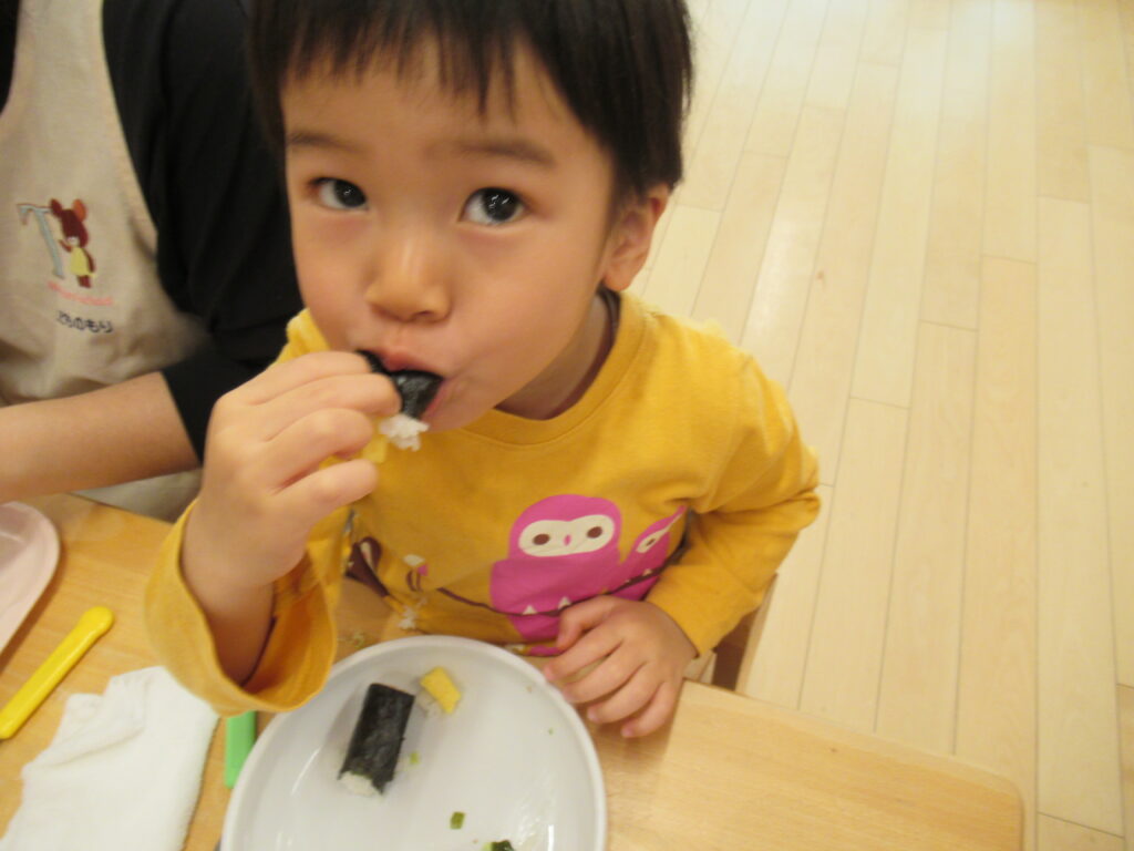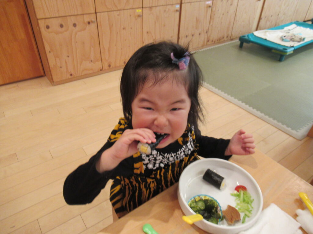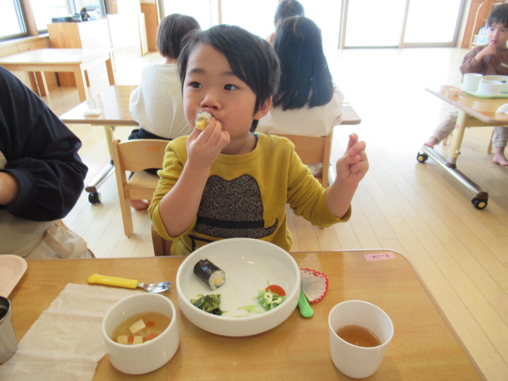幼児さんも未満児さんも前歯でがぶっと細巻きをしっかり噛みちぎっていました。