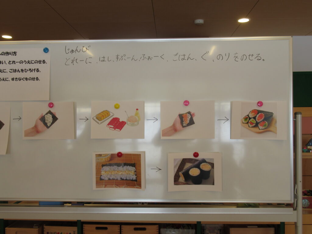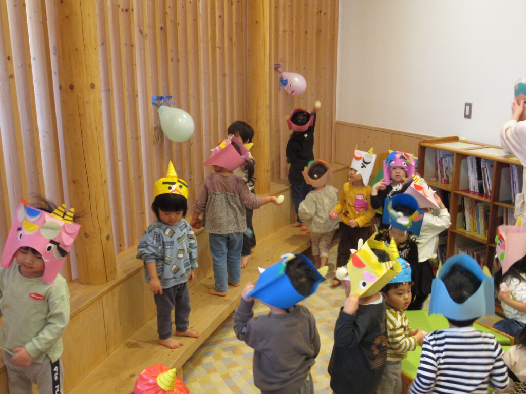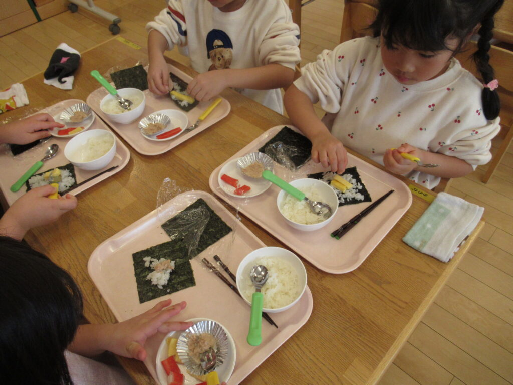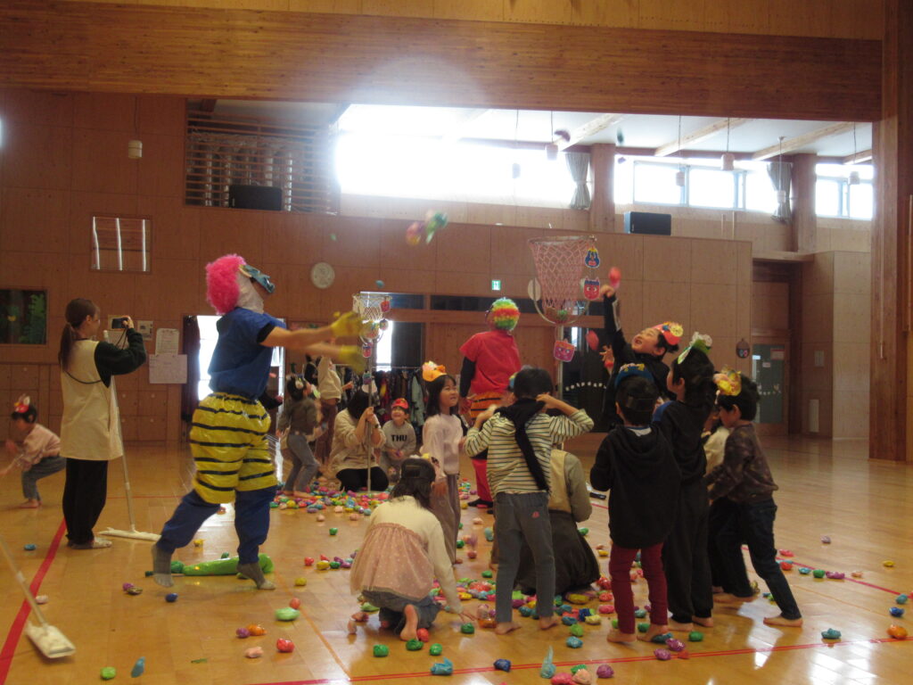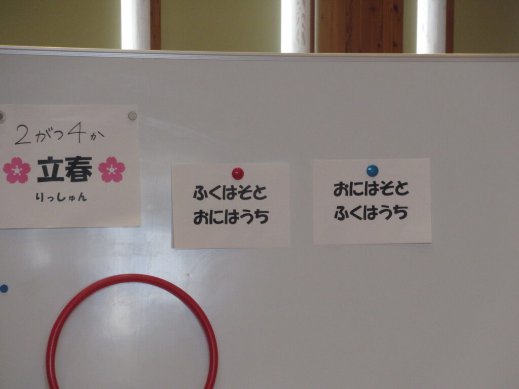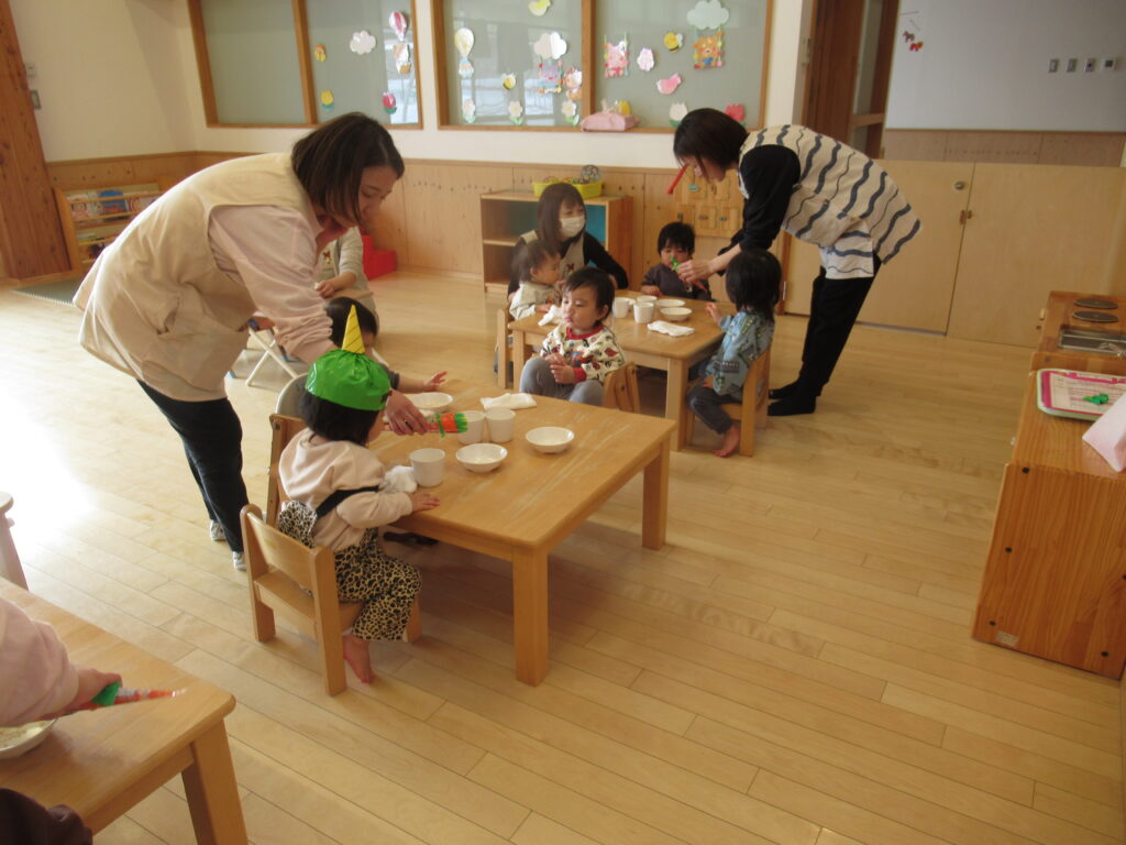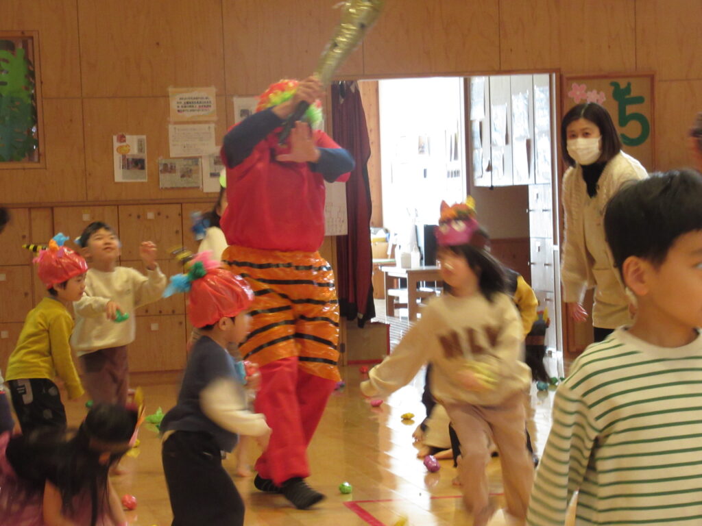 2月3日園内で豆まき会が行われました。乳児クラスでは、泣き虫鬼や怒りんぼ鬼を退治しようと園内のあちこちにいる鬼を探して退治、その後にやってきた福の神からおやつをもらいみんなで食べました。幼児クラスでは、クイズ形式で豆まきとはどんな日なのかをみんなで学びました。途中鬼は登場しますが、みんなで鬼退治をした後は、なかよくなった鬼と一緒に玉入れゲームで楽しみました。その後さくら組では、給食に合わせて自分で手巻きずしを作って食べました。自分で作った手巻き寿司は格別の味だったようです。