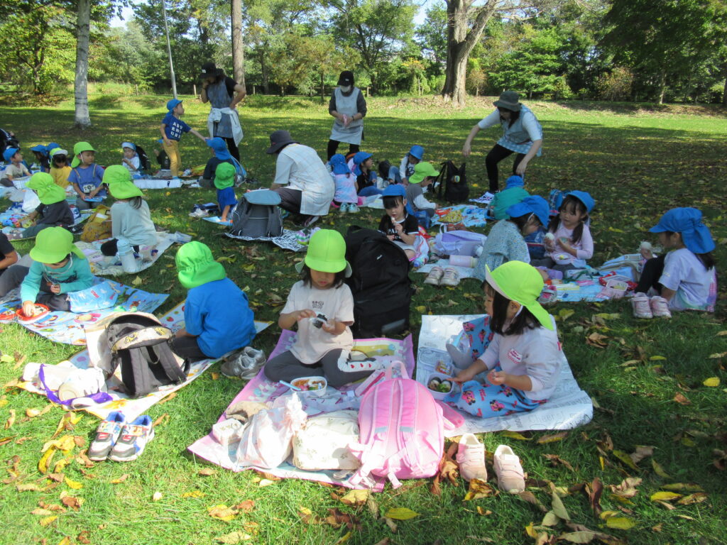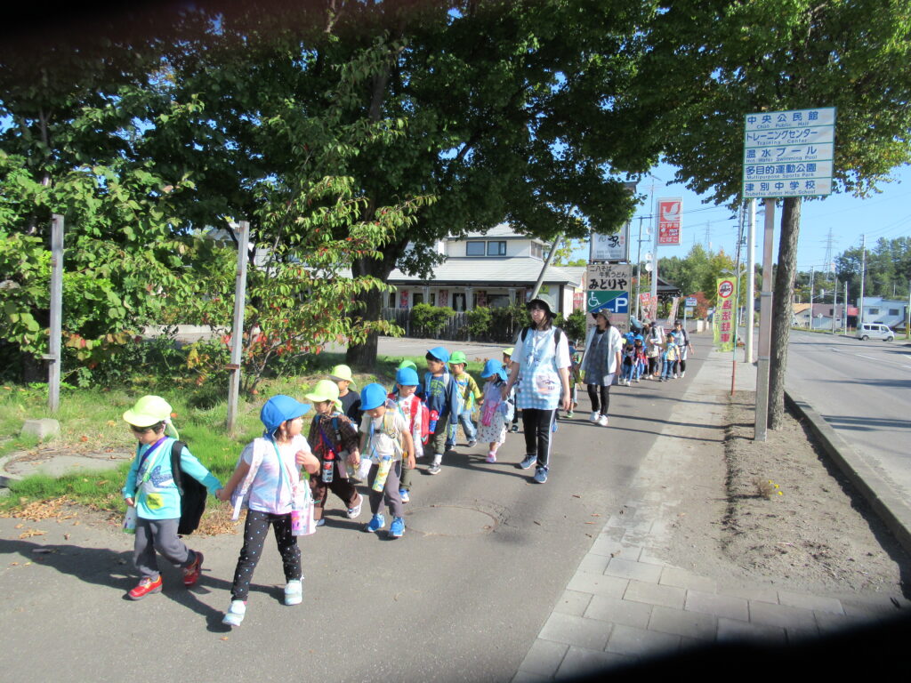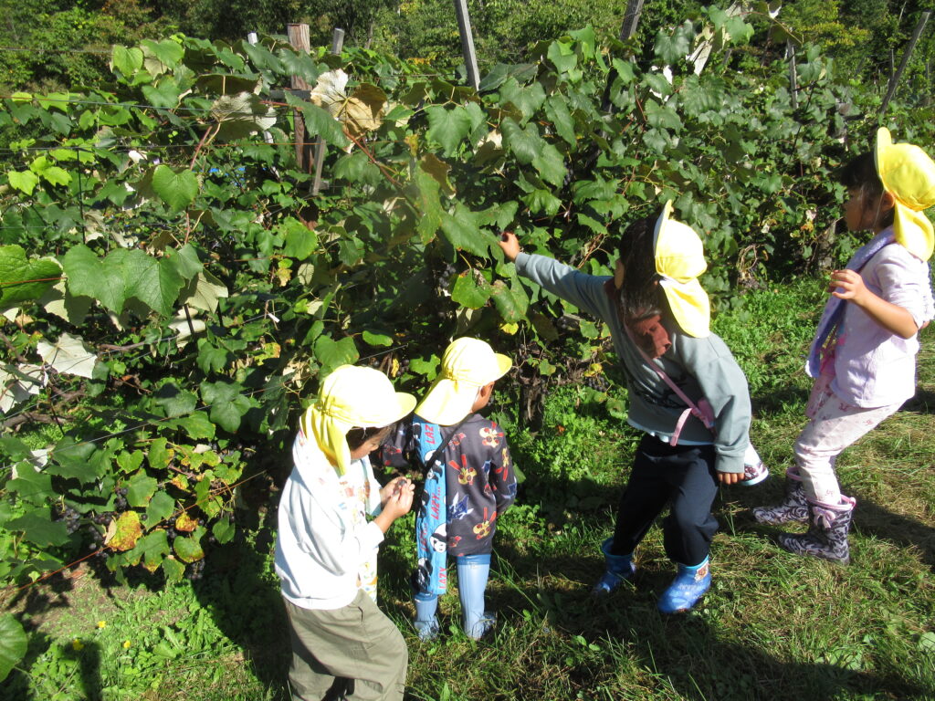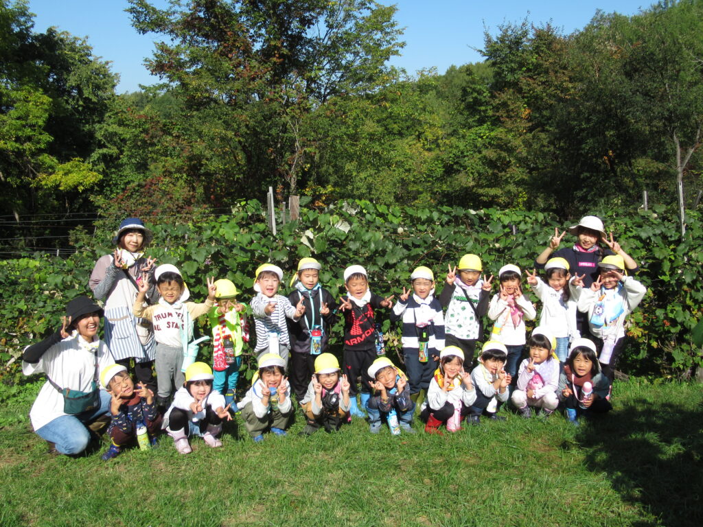 今日は全園児での遠足の日でした。乳児はいつもお散歩に行っている福王寺の裏山を一番高いところまで散策、途中見つけた葉っぱや栗をお散歩バッグに入れて持ち帰りました。昼食は園に戻ってから手作りのお弁当をうれしそうに食べていました。年少・年中児は河岸公園まで行ってきました。前回行ったときは、年長児に手を引かれて公園まで行きましたが、今日は年中児が年少児の手を引き長い距離を歩きました。園に戻った子どもたちは「楽しかったけど、つかれた~」と教えてくれました。年長児はバスに乗って隣の北見市までブドウ狩りに行きました。「楽しかった!」「お弁当おいしかった」と口々に声に出しながら帰ってきました。