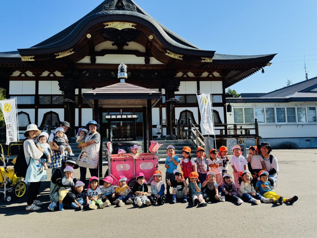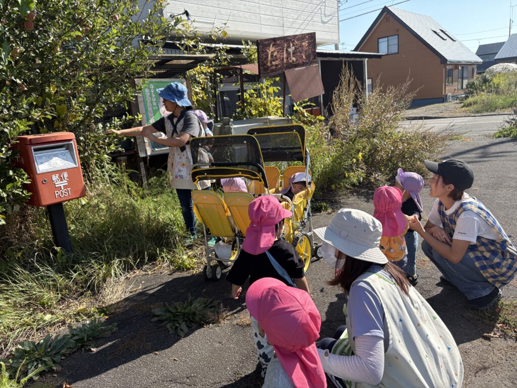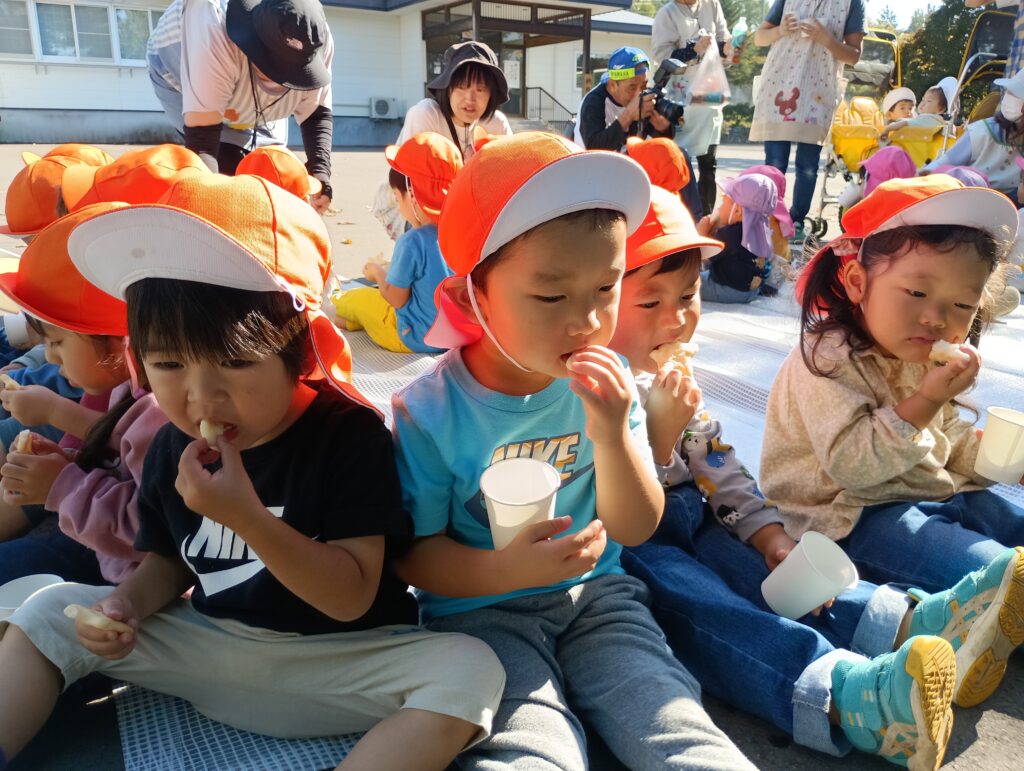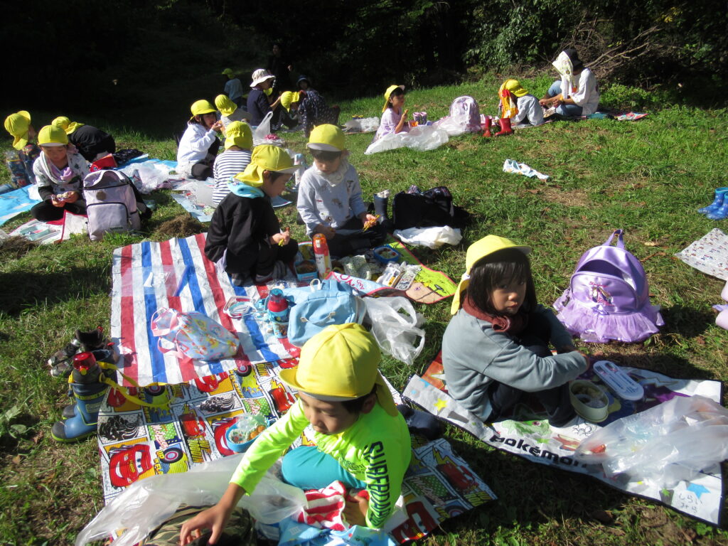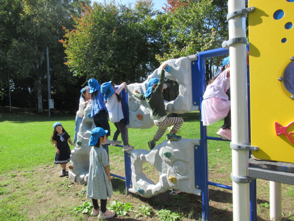 今日は全園児での遠足の日でした。乳児はいつもお散歩に行っている福王寺の裏山を一番高いところまで散策、途中見つけた葉っぱや栗をお散歩バッグに入れて持ち帰りました。昼食は園に戻ってから手作りのお弁当をうれしそうに食べていました。年少・年中児は河岸公園まで行ってきました。前回行ったときは、年長児に手を引かれて公園まで行きましたが、今日は年中児が年少児の手を引き長い距離を歩きました。園に戻った子どもたちは「楽しかったけど、つかれた~」と教えてくれました。年長児はバスに乗って隣の北見市までブドウ狩りに行きました。「楽しかった!」「お弁当おいしかった」と口々に声に出しながら帰ってきました。