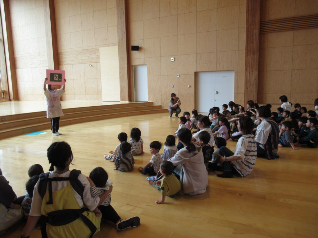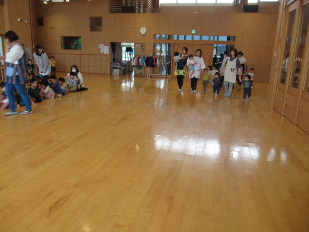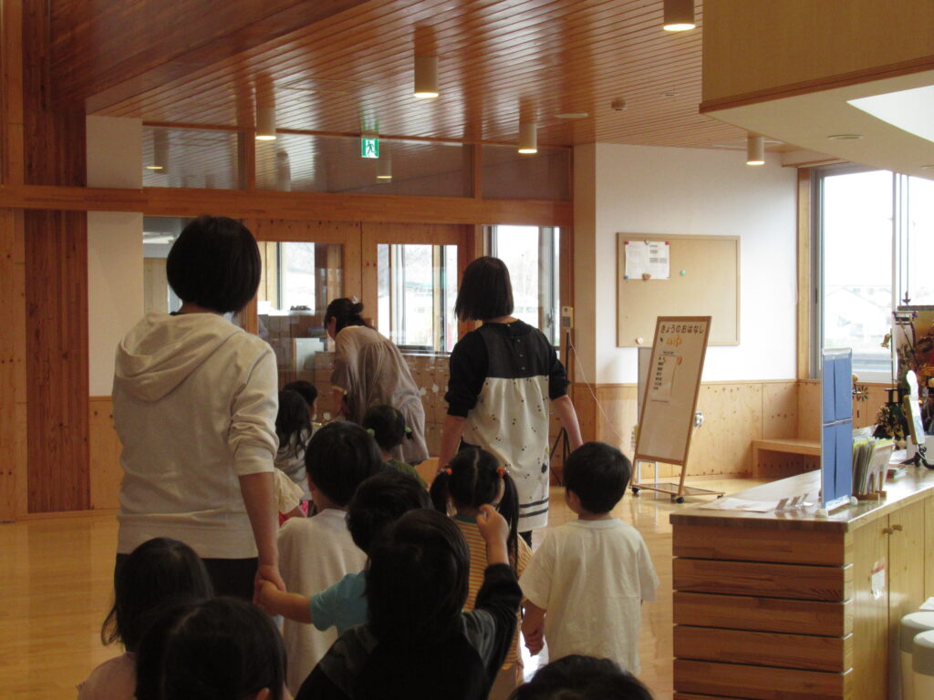 入園式から3週間、新入園児も園生活に慣れ穏やかに日々を過ごす事ができるようになりました。今日は4月の避難訓練でした。放送を聞き職員と落ち着いて遊戯室に集まってきた子ども達に、避難訓練ってどうしてするのかなと伝えた後、各クラス非常口がどこにあるのか職員と一緒に探しました。「あったよ」と指さしながら皆で確認をしました。