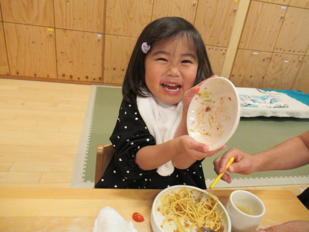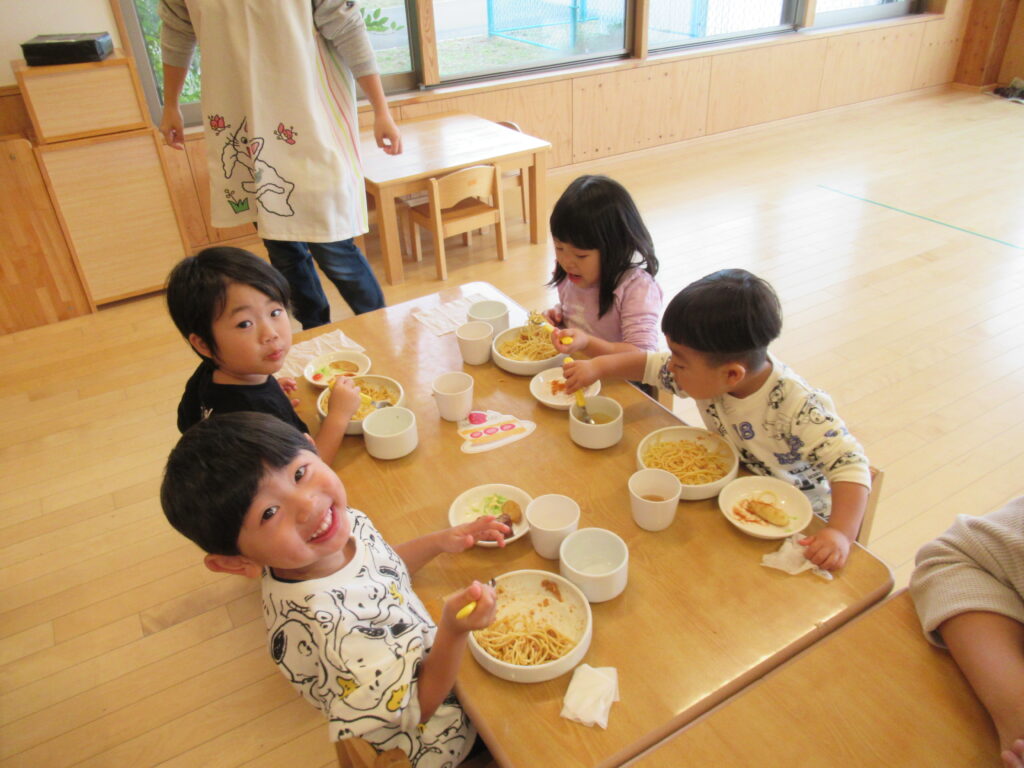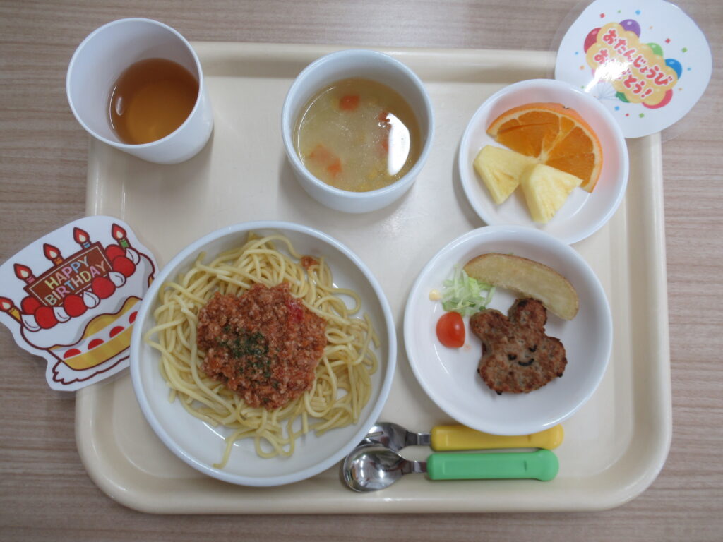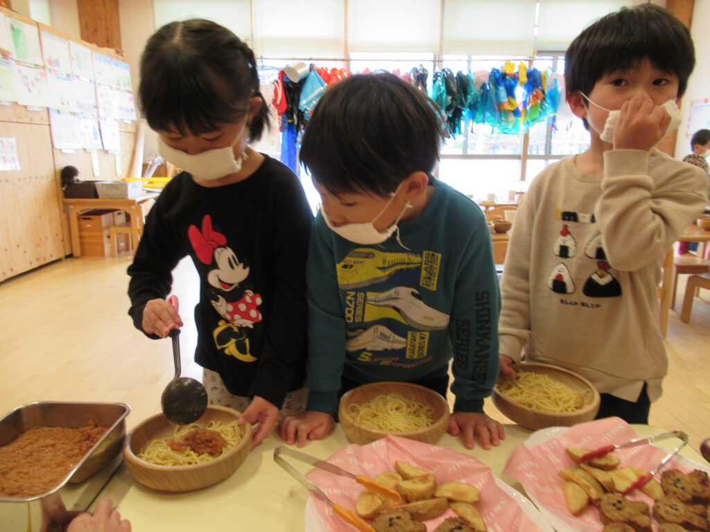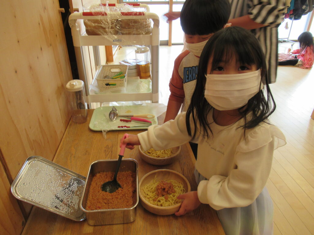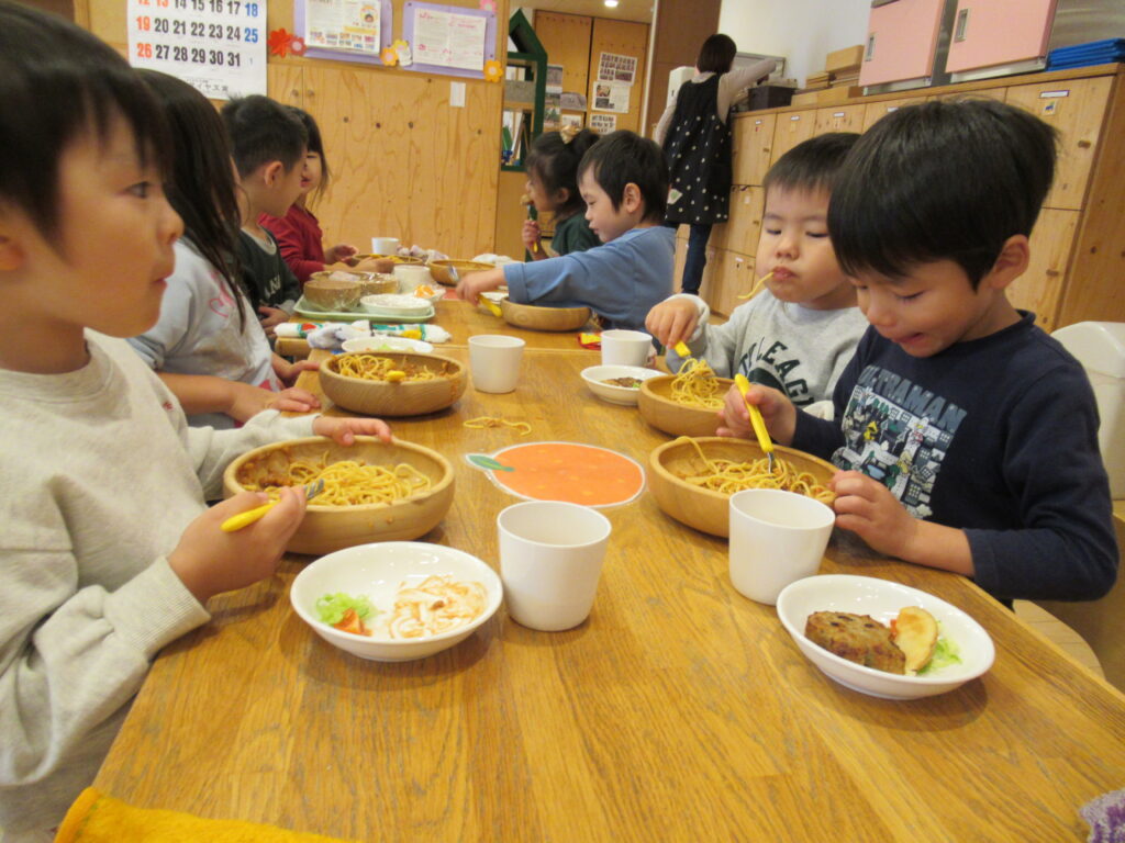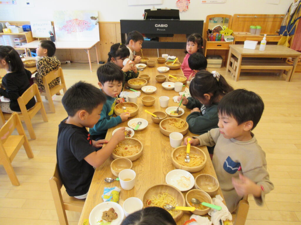 11月のお誕生会メニューはミートソーススパゲティでした。今回はふじ組もミートソースを自分でかけました。みんな好きな量のミートソースをかけて、スパゲティを食べてました。
