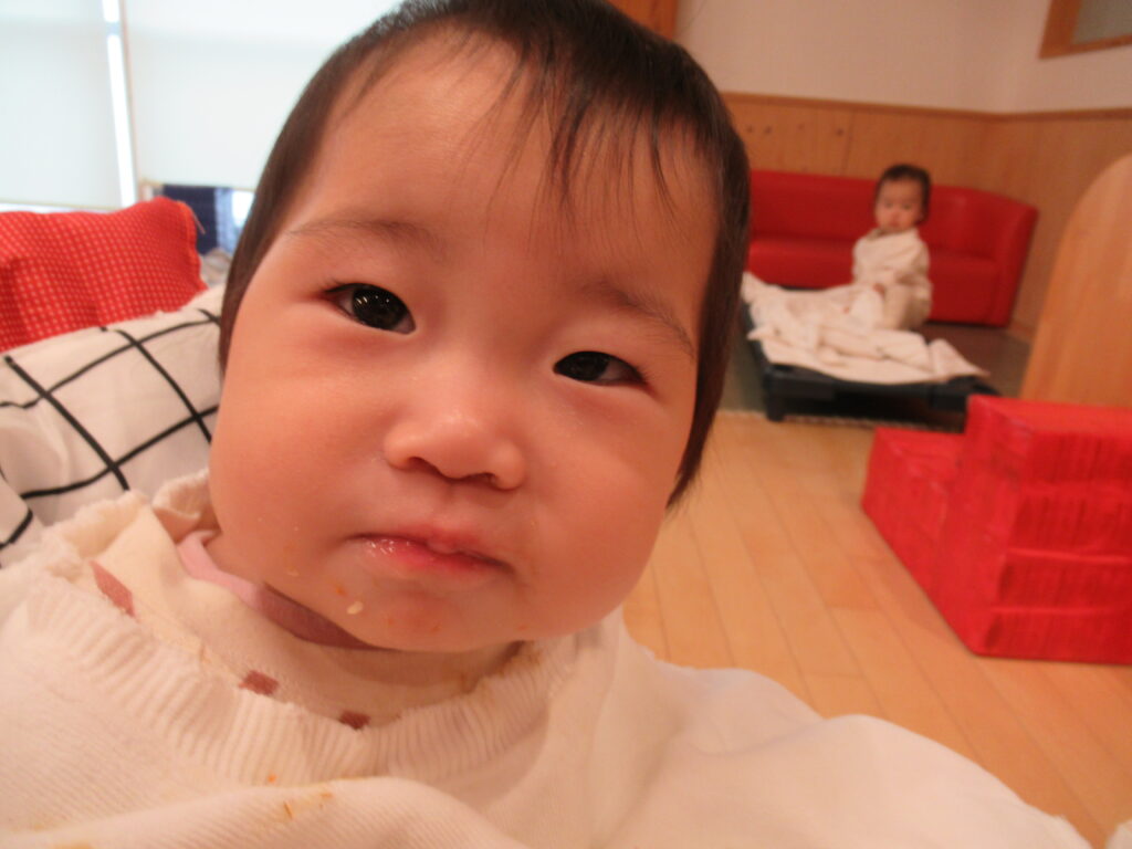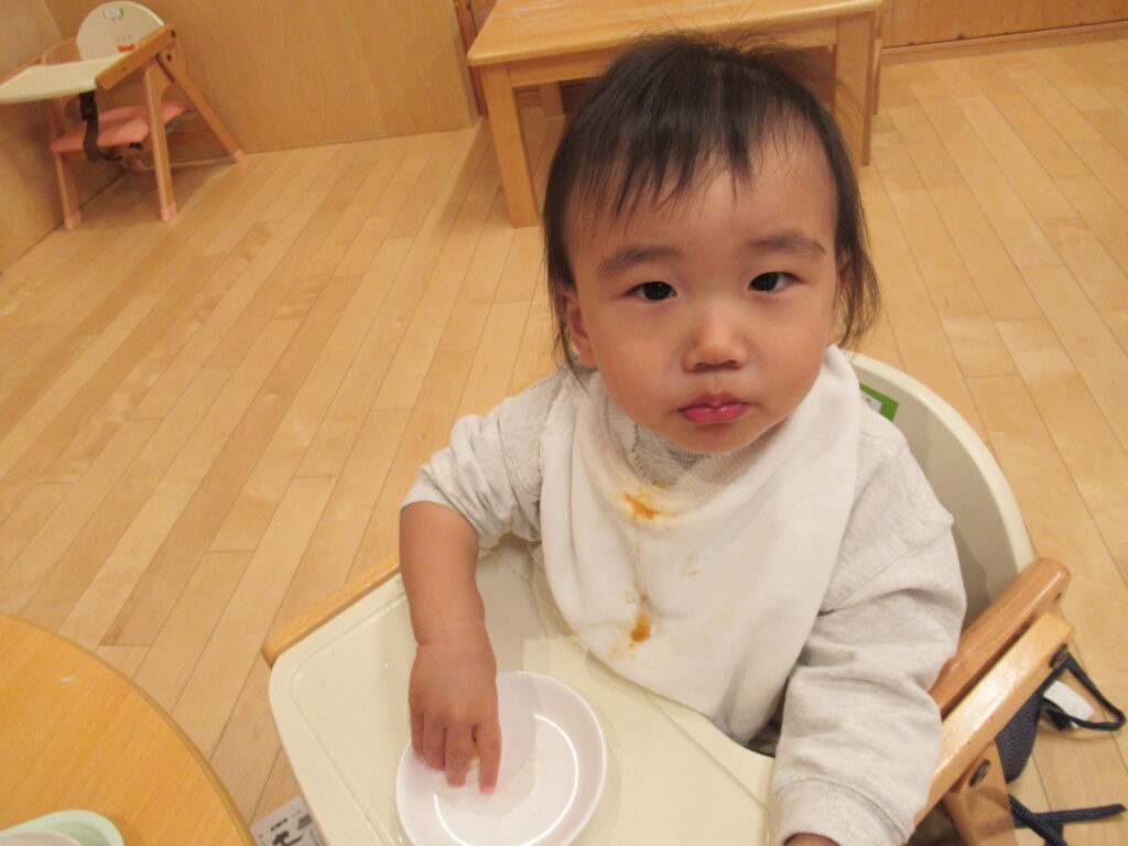 すずらん「全部食べたよ!」といい笑顔。離乳食の子たちも、毎日一生懸命ごはんを食べてます。
