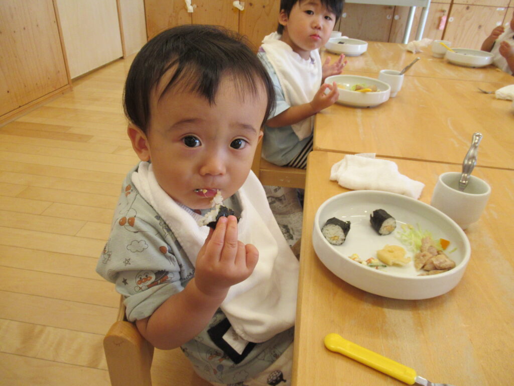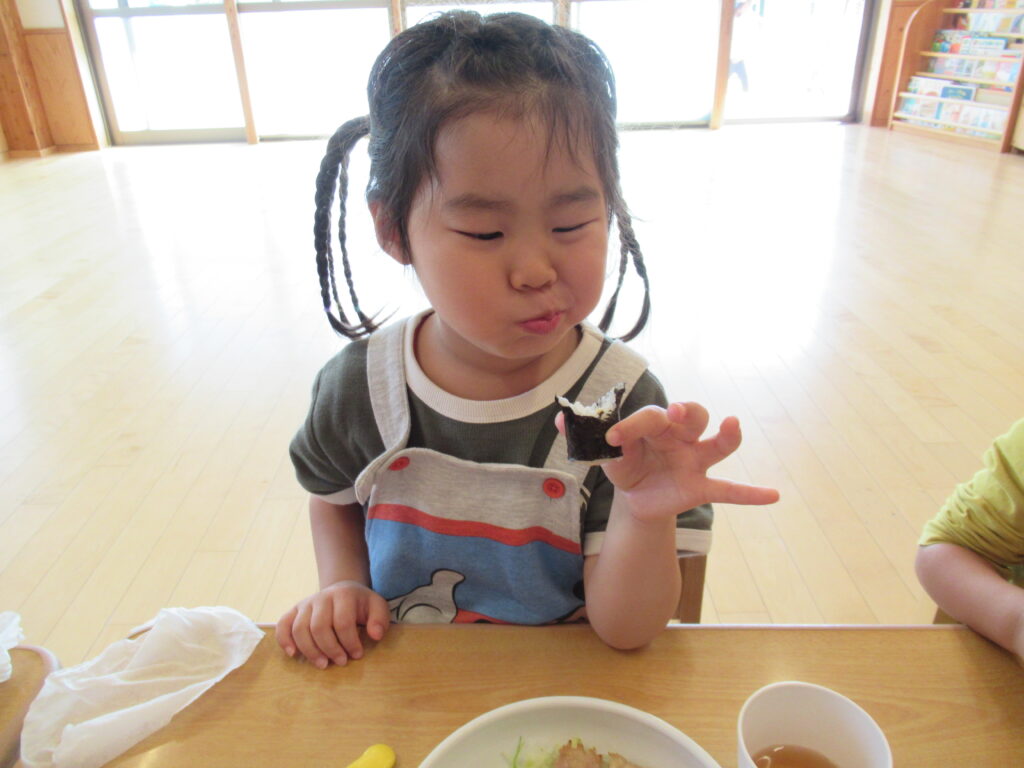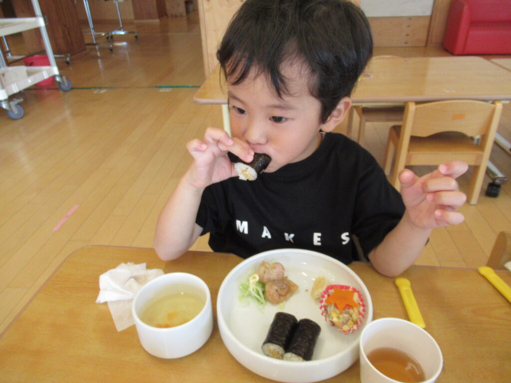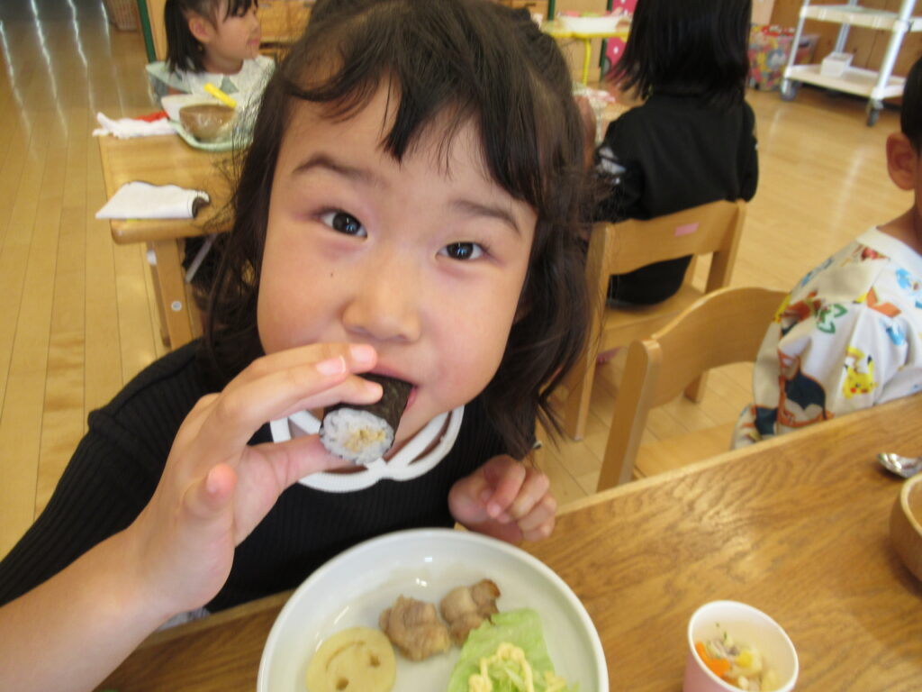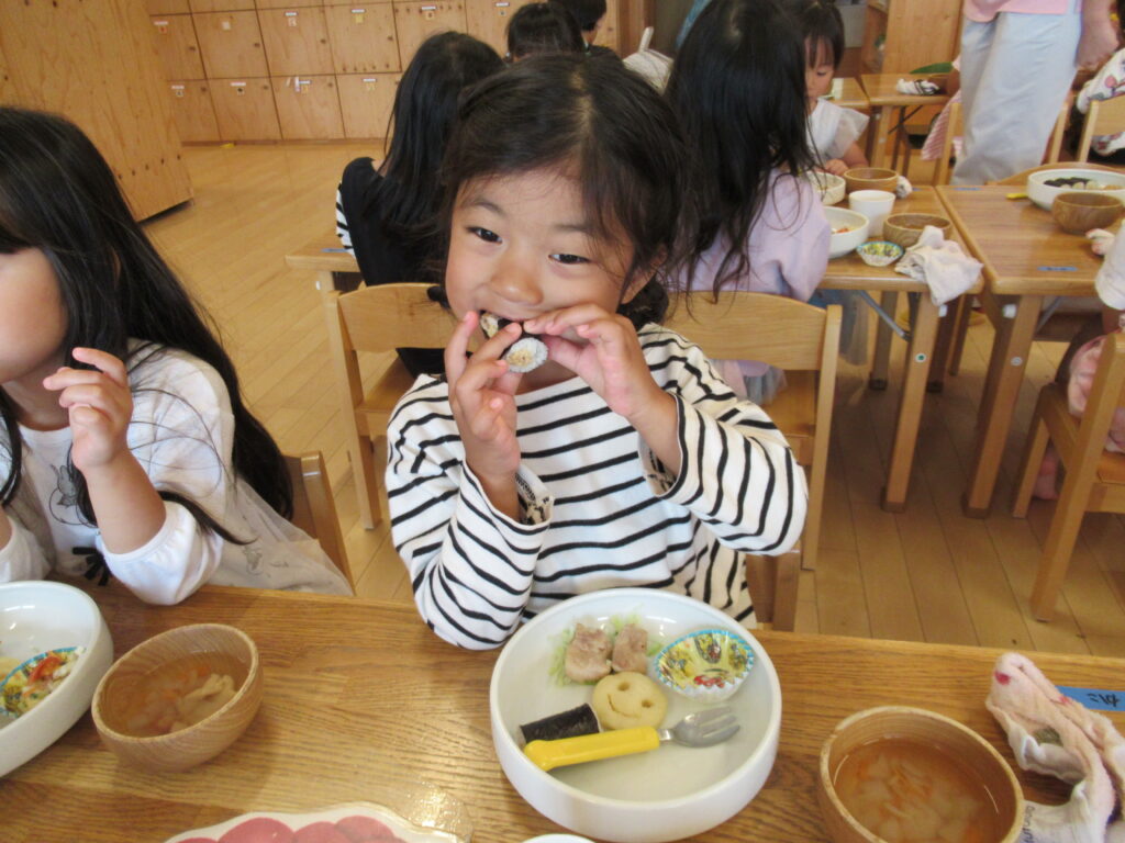 9月のお誕生会メニューは納豆巻きでした。いつもの納豆巻きよりも少し大きめにカットして、前歯でがぶりと噛み取るようにしました。未満児も以上児も上手に前歯で噛み取っていました。こども園にいる6歳までの期間は噛む力を育てるゴールデンタイムです。安全面に配慮しながら、噛み取りやよく噛むメニューを取り入れています。10月は「よく噛んで食べよう」の食育講話のなかで、カンパンや昆布を食べてみます。よく噛むことは、発音にもつながっていきます。食材の大きさを一口で入らない大きさにするだけでも、前歯で噛み取りの練習になります。おうちでも簡単に出来るのでおすすめです。