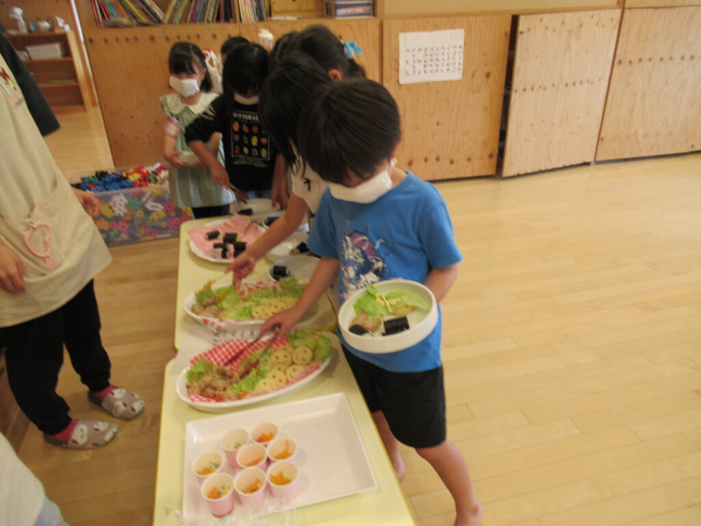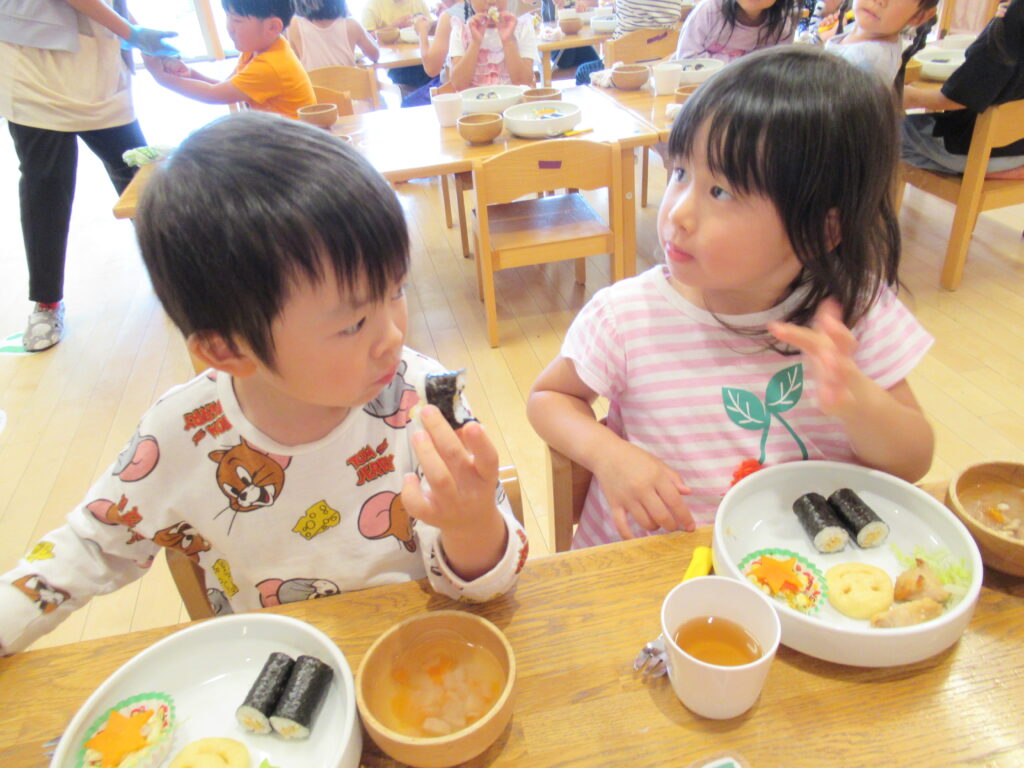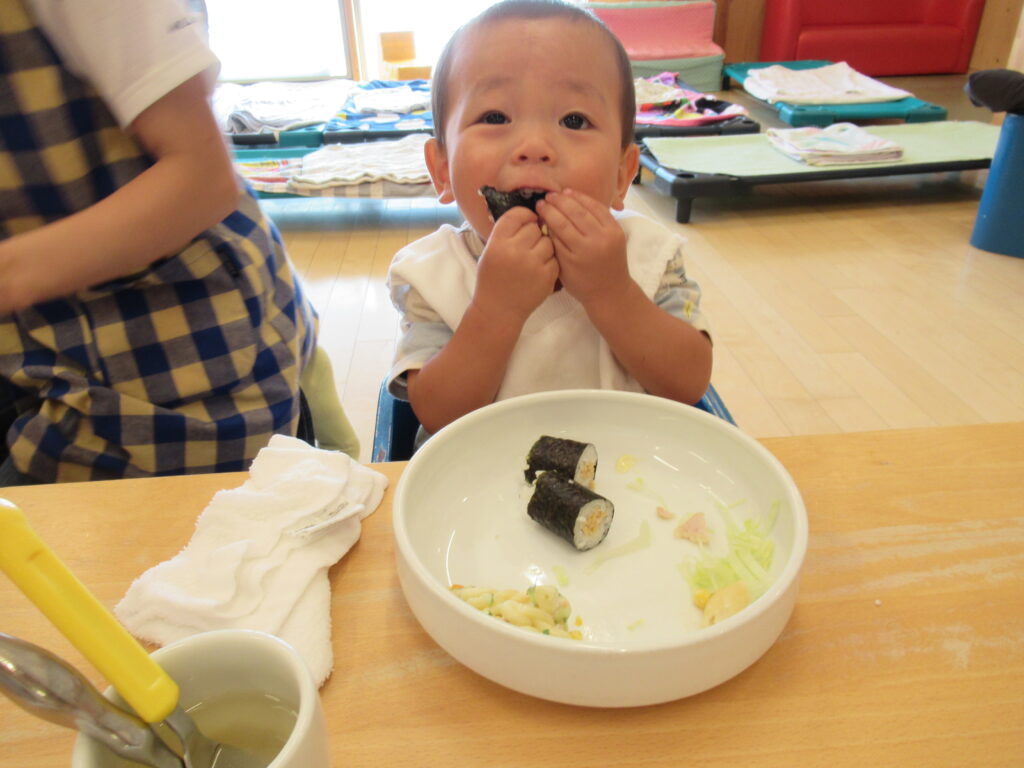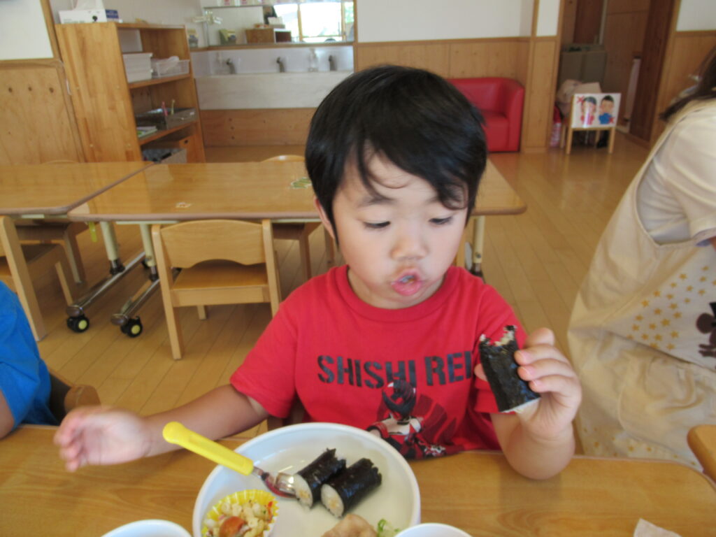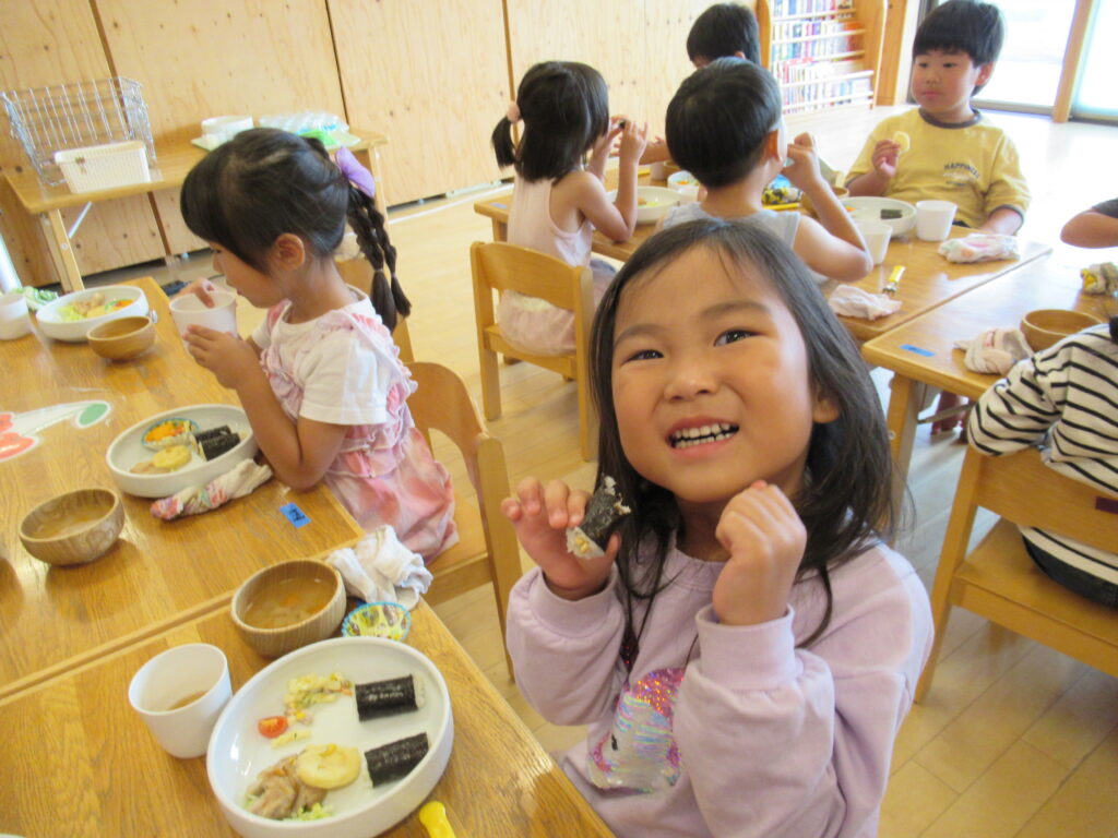 9月のお誕生会メニューは納豆巻きでした。いつもの納豆巻きよりも少し大きめにカットして、前歯でがぶりと噛み取るようにしました。未満児も以上児も上手に前歯で噛み取っていました。こども園にいる6歳までの期間は噛む力を育てるゴールデンタイムです。安全面に配慮しながら、噛み取りやよく噛むメニューを取り入れています。10月は「よく噛んで食べよう」の食育講話のなかで、カンパンや昆布を食べてみます。よく噛むことは、発音にもつながっていきます。食材の大きさを一口で入らない大きさにするだけでも、前歯で噛み取りの練習になります。おうちでも簡単に出来るのでおすすめです。